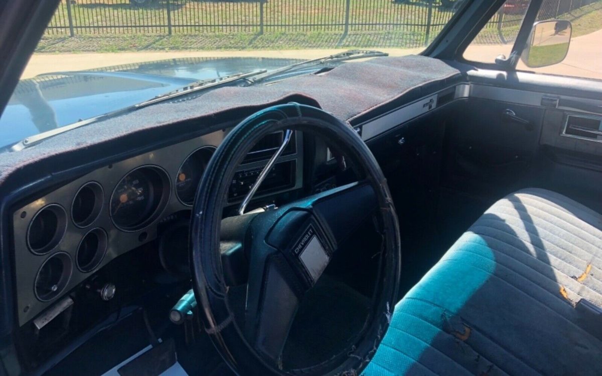 Sporting the high-end Silverado trim, the blue interior matches the condition of the exterior. The brushed aluminum instrument panel, gauges in place of warning lights, door pull straps, and lower door panel carpeting were all part of the Silverado package. The carpeted dash cover is concealing a cracked dash, the bench seat has some tears, the headliner needs to be replaced, and the carpet shows some wear. Don’t worry, this is an air-conditioning equipped truck.