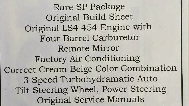 This one is nice. Sad that there are no inside pics. But if the outside speaks for the inside it should be nice. I’ d love it but i would also remove the 454 fender emblems they just look outta place and the air cleaner decal. Probably has 2.41 or 2.73 gears in back, posi i hope that should give quiet highway cruising and still decent economy for the engine