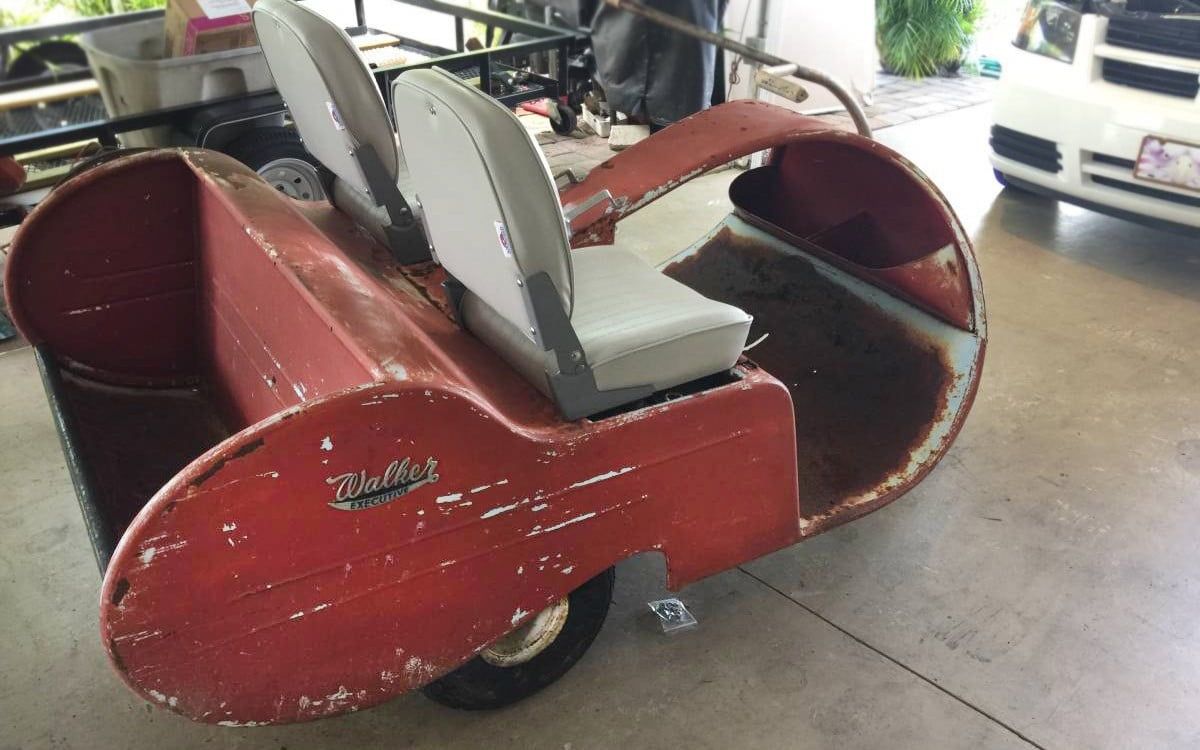 The seller has this Walker Executive golf cart listed as a 1955 model but the company didn’t start to make them until 1957 so I’m not sure what year it really is. I wish they would have included a photo of a VIN tag or some other numbers but maybe there isn’t such a thing on this one. Max Walker started making the Executive golf cart due to his frustration with the battery-powered golf carts at the time. They always seemed to run out of juice towards the last hole.