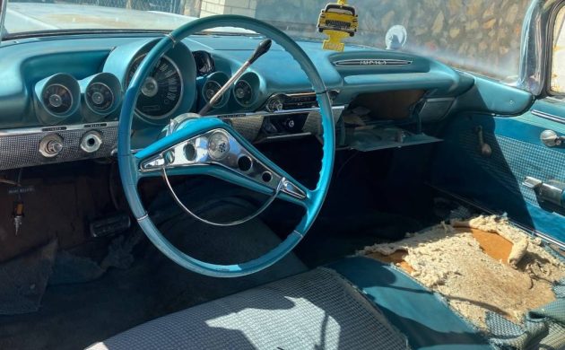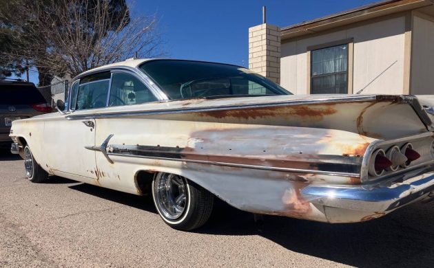 Our thanks go out to tipster Mitchell G. for finding this cool Chevy and bringing it to our attention! The ’60 model came from an era when tail fin popularity was starting to wind down, and many enthusiasts refer to the rear section here more as resembling bat wings, which sounds like a reasonable comparison. It looks like some sheet metal repairs were already made on the driver’s quarter, but the same section on the other side is still showing rust behind the wheel, which seems to be the worst part of the body. Hopefully, most of the panels will be sturdy enough to salvage, and I’m envisioning a sharp cruiser once the exterior is straightened out and painted.