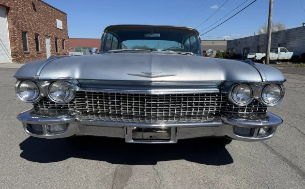 Technically, this rig is a six-window Sedan deVille, as there was also a four-window version too. Statistics tell us that the six-window version was more popular, with 22K units produced versus only 9K for the four-window model. The seller sums up this car rather well by stating, “Needs restoration or drive as is. Would make a cool rat rod. Frame is solid. Floors were patched but not professionally. Has dings and dents. Lower rear quarters need work. Was painted a satin color. Kinda cool looking. Again, not professionally…. Chrome and stainless is in pretty good…” I’m on the fence with the whole satin finish thing; by and large, I don’t think it does a car, really any model or age, any favors (especially on a new Mercedes!). In this case, well, I have to go back to my initial assessment; it looks like a space travel caricature. Of course, it can always be refinished, but at 225″ in length and 80″ in width, we’re talking a lot of prep and paint. Speaking of size, research details that all Cadillacs in ’60, regardless of model or trim, rode on a 130″ wheelbase with just the Fleetwood being the lone exception with its 149.75 inches of stretch. Nice to see is the completeness of the very intricate grille, it appears to be unmarred and unkissed – ditto for the front rammer – it’s still showing nice depth to its chrome plating.