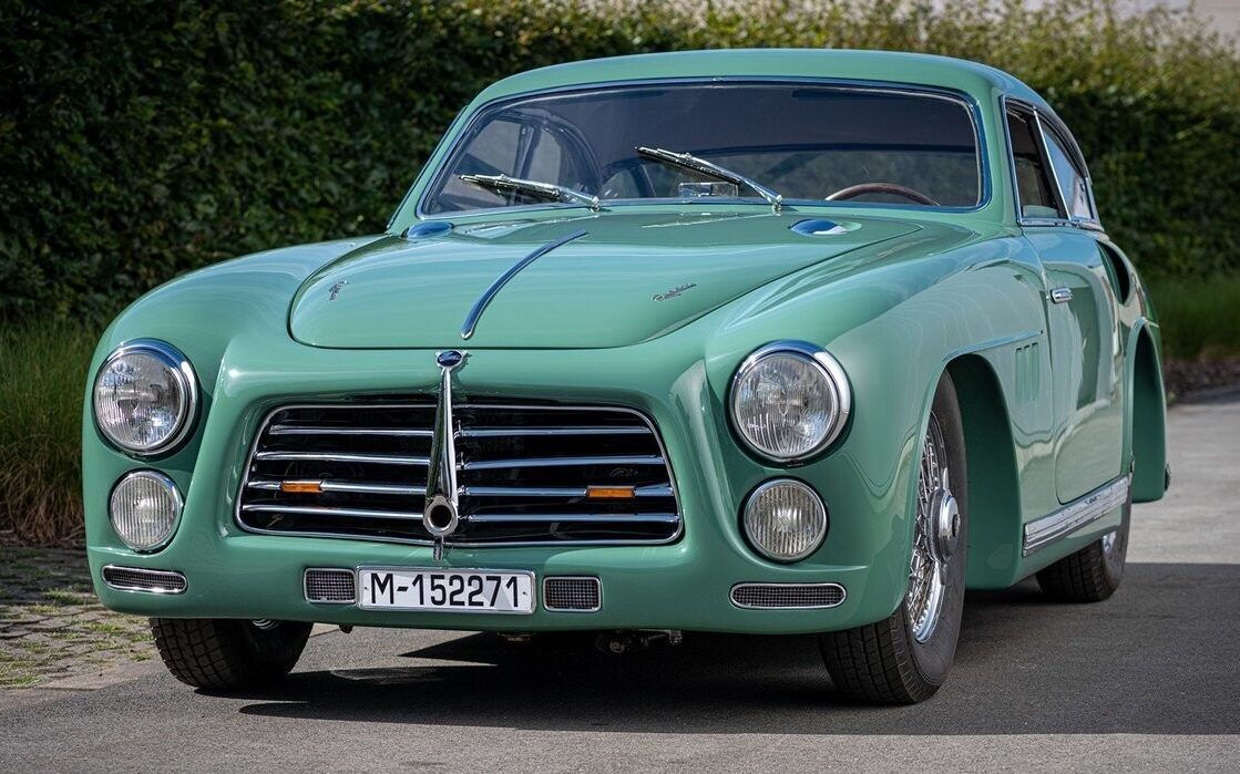 Ricart’s engine was intensely ambitious: a dry sump aluminum V8 with four gear-driven camshafts, sodium valves, a Bosch magneto, and hemispherical combustion chambers. Initially, displacement was 2.5 liters but later engines grew to 2.8 and 3.2 liters. Several carburetor options were offered, from a single Weber up to four for all-out competition. Ricart even experimented with superchargers. Horsepower ran from 165 for the “base” configuration to 225 for the supercharged cars. This car was first assigned chassis 0102 and was apparently a cabriolet. In 1952 it was converted to a Berlinetta at the factory and given a 2.8-liter engine. A five-speed transaxle drives the rear wheels. At least a few examples were fitted with a ZF limited slip differential. Despite the engineering prowess applied to the car’s mechanicals, the Z-102 was not a winner on the track. But this chassis was shown quite successfully by the factory at various concours until an accident in 1954 necessitated a complete rebuild. At that point it was assigned a new chassis number – 0201 – and finally sold as a new car.