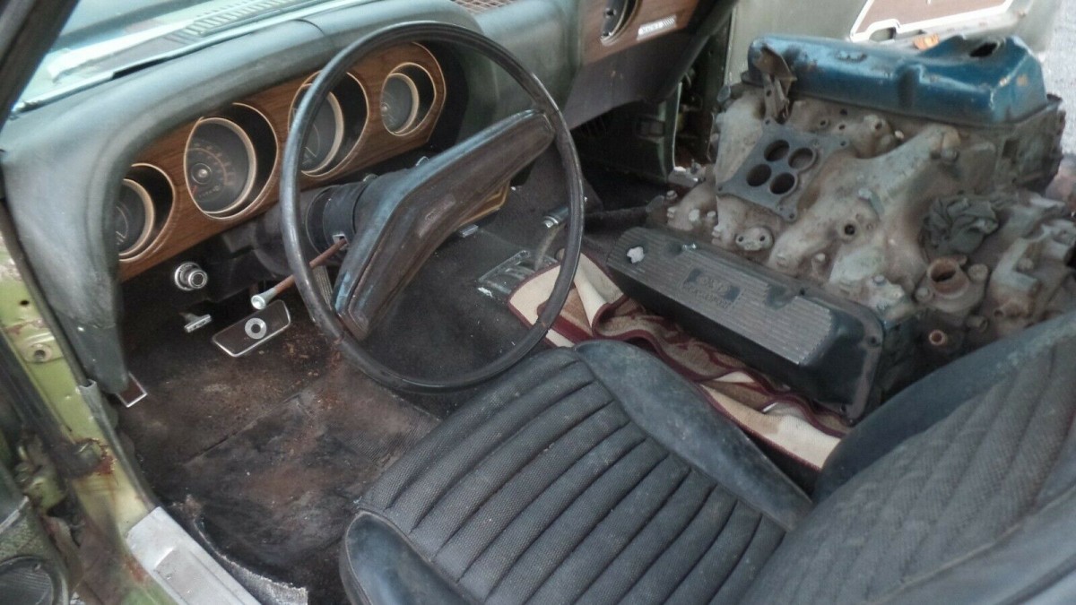 The Mustang’s interior is complete, but it will require a full restoration. It was originally upholstered in Ivy Green Knit Vinyl, but a pair of 1969 buckets upholstered in Black have been added at some point. The rest of the interior is original, but there will still be some work to do. As well as needing new carpet and a replacement dash pad, the door trims have been cut to accommodate speakers. The headliner is in good condition, and the owner indicates that the same is true of the rear seat and the remaining trim. The Mach 1 hasn’t been loaded with heaps of comfort features. However, it does come with an AM radio, along with a Sport Deck rear seat.