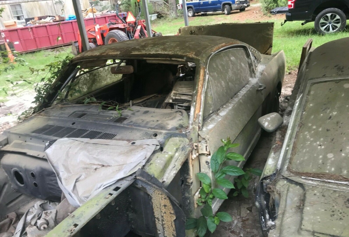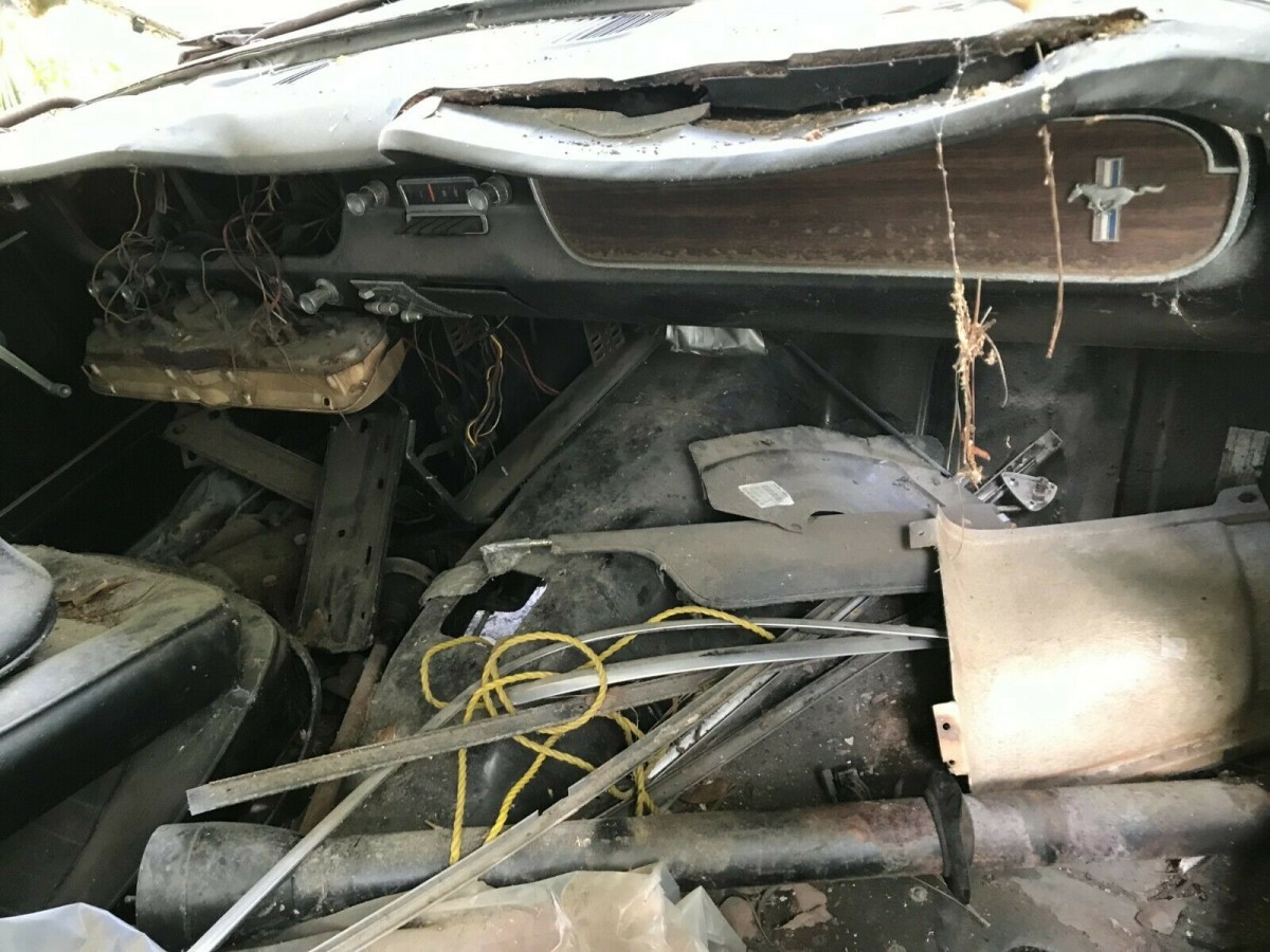 Between the two Fords, a 289 engine has survived that mirrors the one that the white car came with originally, but it will need to be rebuilt. And it also comes with a date-correct and already re-built 4-speed Toploader. The seller says most of the pieces needed to make one good Mustang should be there, they’ll just have to be gathered up and included when the buyer brings two trailers to haul everything away.