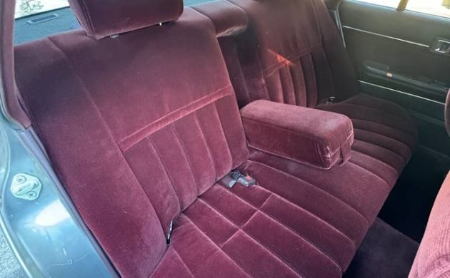 The Cressida’s nicely-appointed interior is well preserved and is a 1980’s-era time machine. The velour burgundy comfy seats do not show wear and no rips or tears are visible. The door panels and headliner are clean and in very good shape as well. The burgundy dash looks great with no cracks and all lights and gauges work (including the A/C and factory Technics sound system).