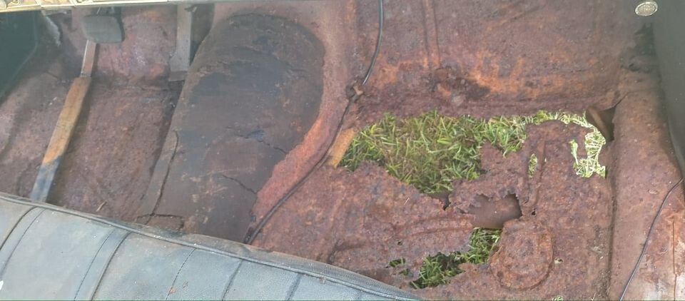 It’s hard to tell the factory color of Evening Orchid with all the patina the Chevy has accumulated. We’re told the body and frame are mostly solid, but it goes deeper than just surface rust. The floorboards and trunk have holes in them, so new metal will have to be welded in. The windshield is cracked, but the rest of the glass may be okay, and we’re told all the exterior trim is in place. The interior is going to need a complete kit, from upholstery and door panels to carpeting and headliner.