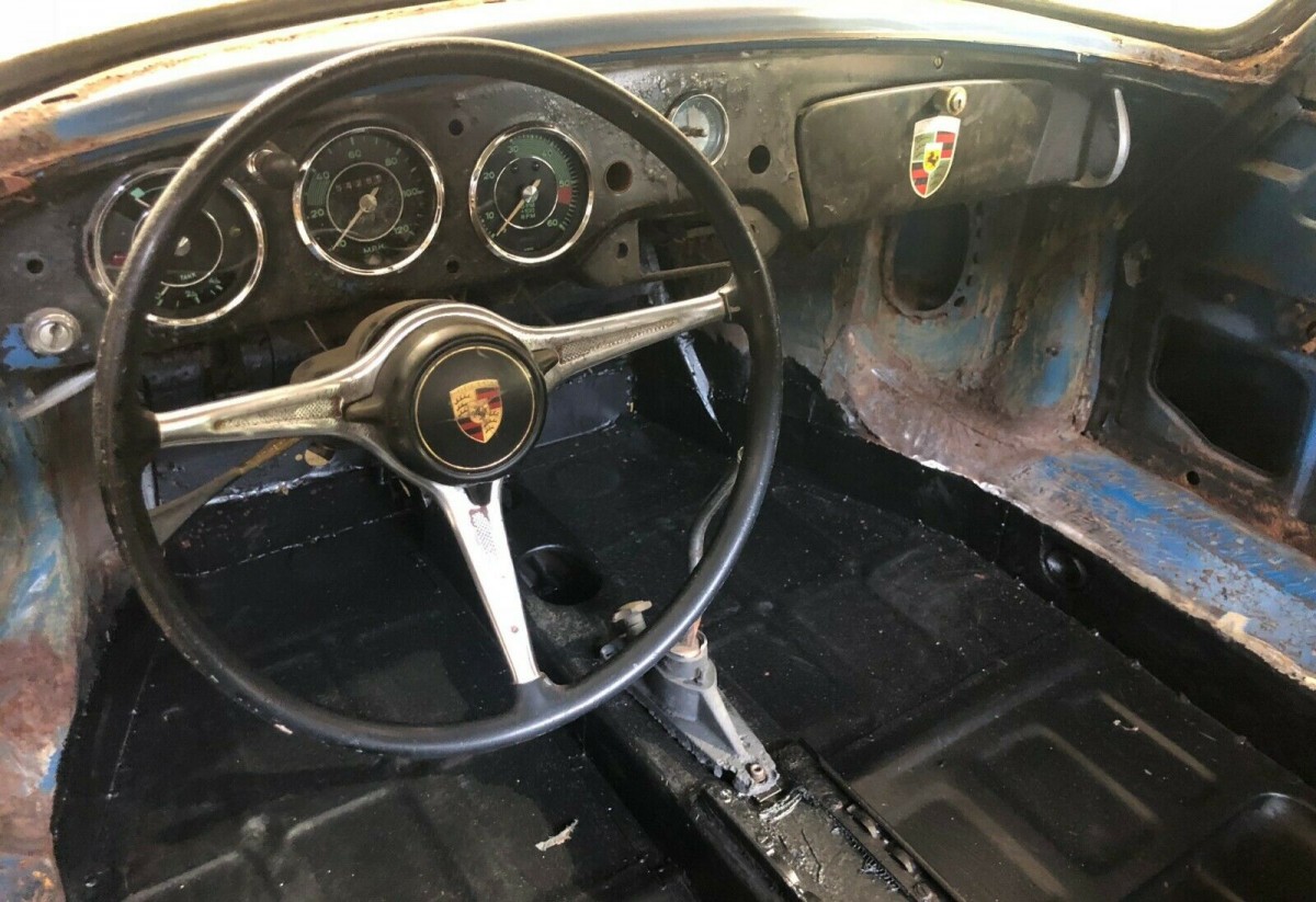 The seller notes Royal Blue was one of four “Special Colors” Porsche offered that year. The rarity of and interest in unique paint colors is truly a subjective matter, but it does make a difference on a collector car like the 356 if you’re weighing waging a full restoration. This car looks straight up and down the sides, but there is some odd wrinkling in the C-pillar. Despite new floors, there’s plenty of rust to deal with.