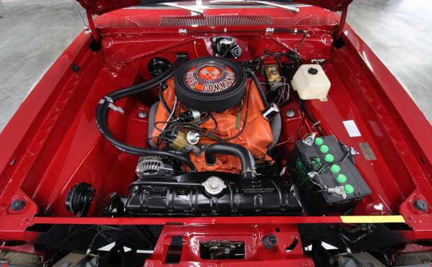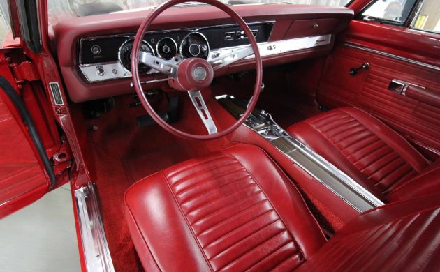 The restoration of this ‘Cuda didn’t end when the panels and paint were perfect, because the owner lavished plenty of TLC on its interior. It received a complete retrim, presenting in as-new condition. The Red vinyl upholstered surfaces and carpet show no evidence of wear, and the dash and pad look perfect. Bucket seats, a console, and an AM radio add a touch of luxury, while the driver can monitor proceedings via the Rally gauges and factory tachometer.