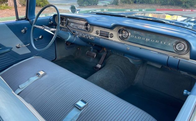 It also, like most Oldsmobile 88s, had the optional “Jetaway Hydra-Matic” transmission. Being a Dynamic 88, which cost nearly $400 less than an equivalent Super 88, it’s no surprise that this car appears to have few extra-cost options, but it hardly mattered in 1960. Every Oldsmobile got a space-age interior included with the base price, and this one is “factory original.” The seller says that “the steering wheel, instrument cluster, dash pad, headliner, package tray, carpet, rubber floor mat, upholstery and door panels are in excellent condition.”
