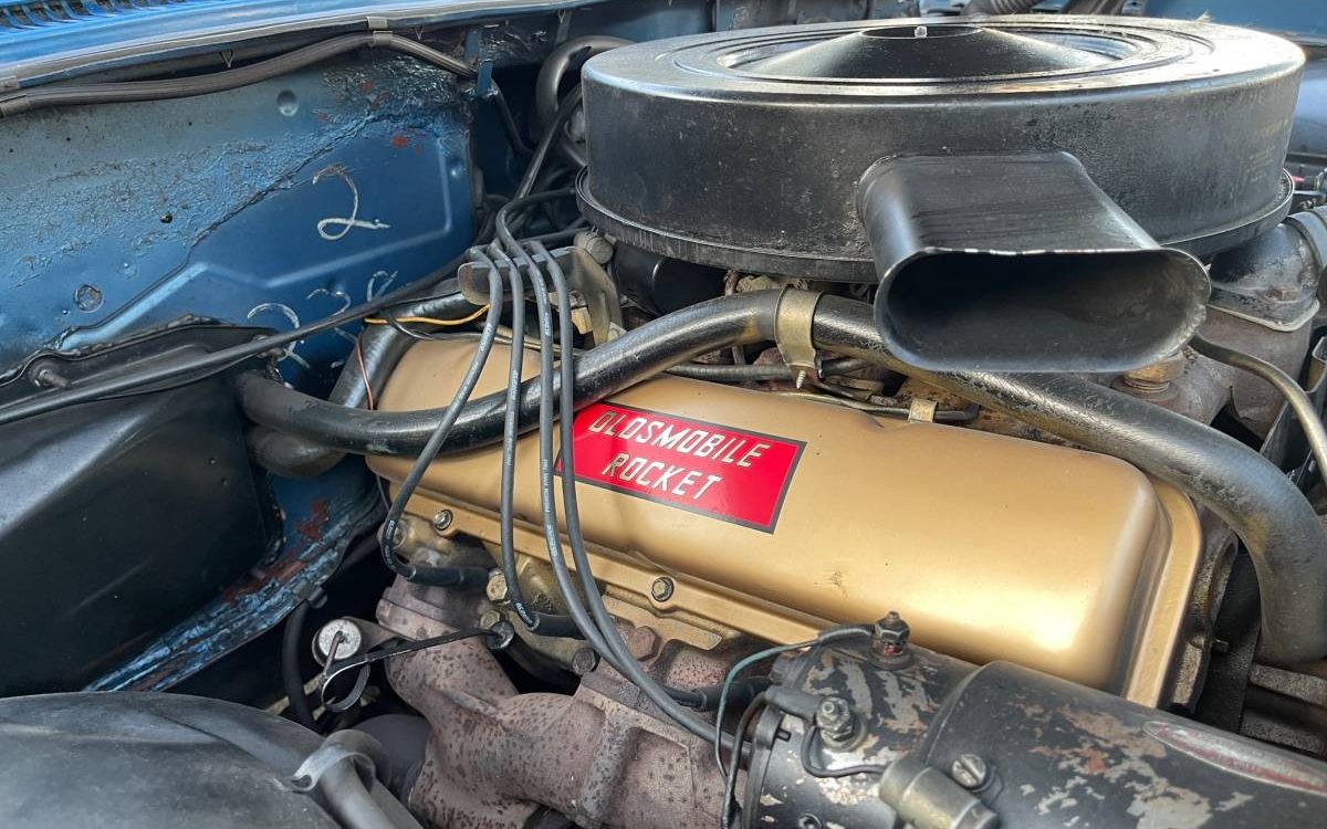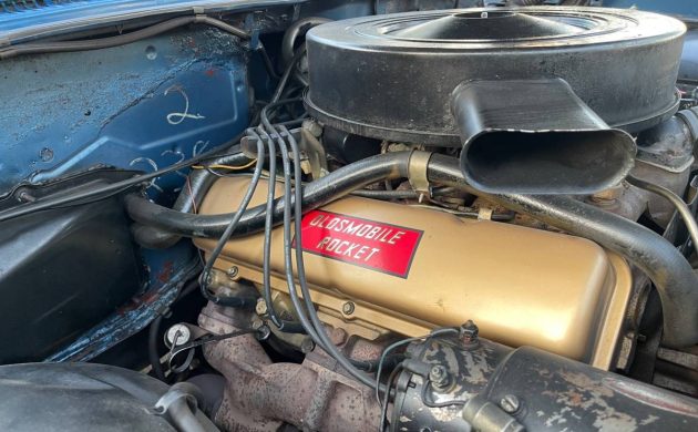 Although the big 394 was standard in the Super 88 and 98, the Dynamic 88 used the smaller 371-cubic-inch version of the “Rocket” V8. With a two-barrel carburetor and an 8.75:1 compression ratio, the 371 gave “Rocket ‘Go’ on lower-cost regular gas.” In reality, with a Rochester two-barrel carburetor, the 371 mustered 240 horsepower and 375 lb.-ft. of torque, a far cry from the muscular 394’s 315 horsepower and 435 lb.-ft. The bigger engine alone would have been a good reason why many stepped up to a Super 88, but the seller says that this car is “peppy and powerful.”