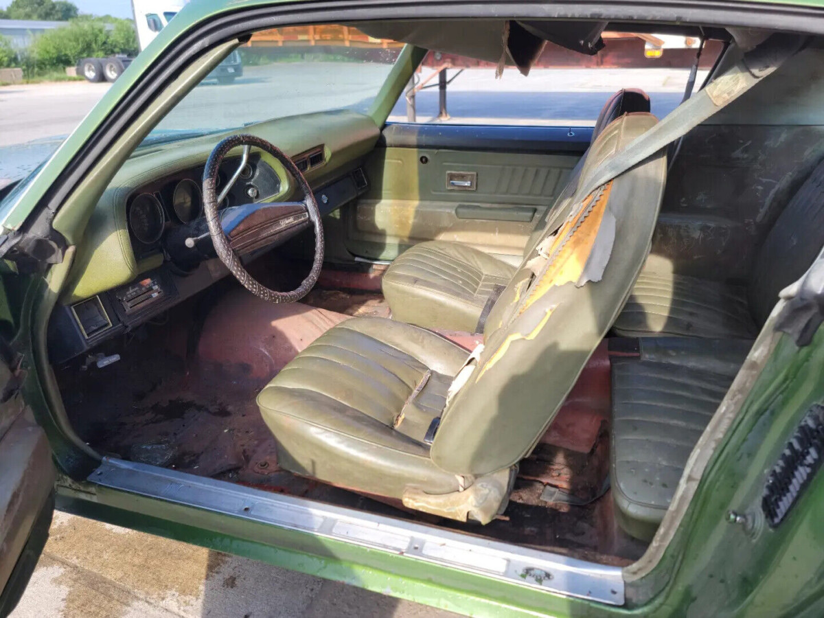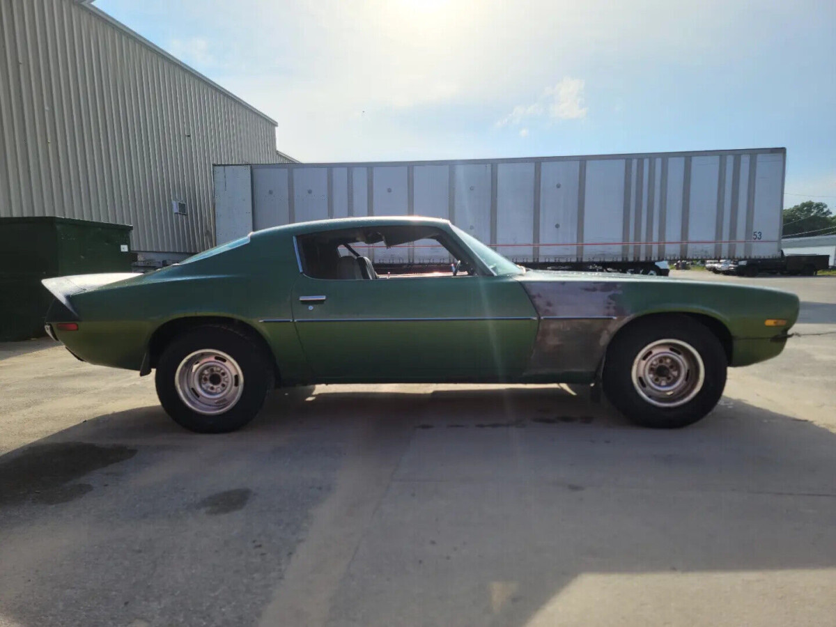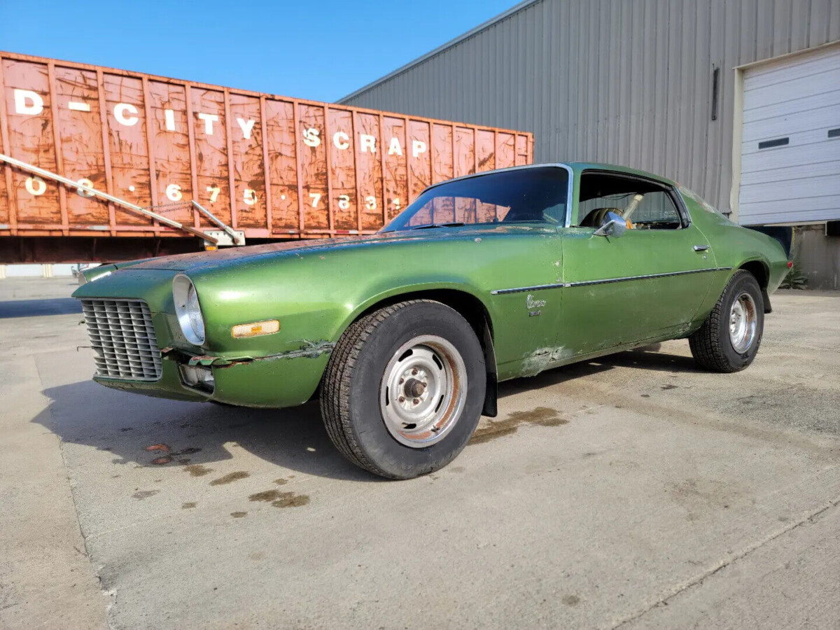 The green interior is faded, torn and dirty but looks to be all there. This Camaro looks unique because it has bucket seats, no console and a column shifter. As most enthusiast know, the Firebird and Camaro received high back bucket seats in 1971. In 1970, both the Firebird and Camaro has low back bucket seats with headrests.