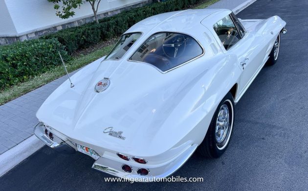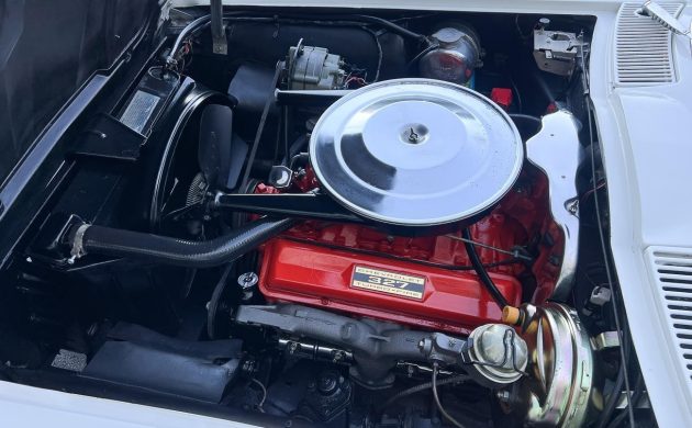 We’re told this Ermine White ‘Vette is numbers-matching at possibly just 44,000 actual miles. The engine is the 327 cubic inch “Turbo-Jet” V8 that was rated at 300 hp, paired with a 4-speed manual transmission (what else). Other than the paint, everything is original and in good or better condition overall. The Saddle Tan interior shows some wear, but not enough to get worked up over. Apparently, the car has lived in a private collection for some time, and it needs a new home.