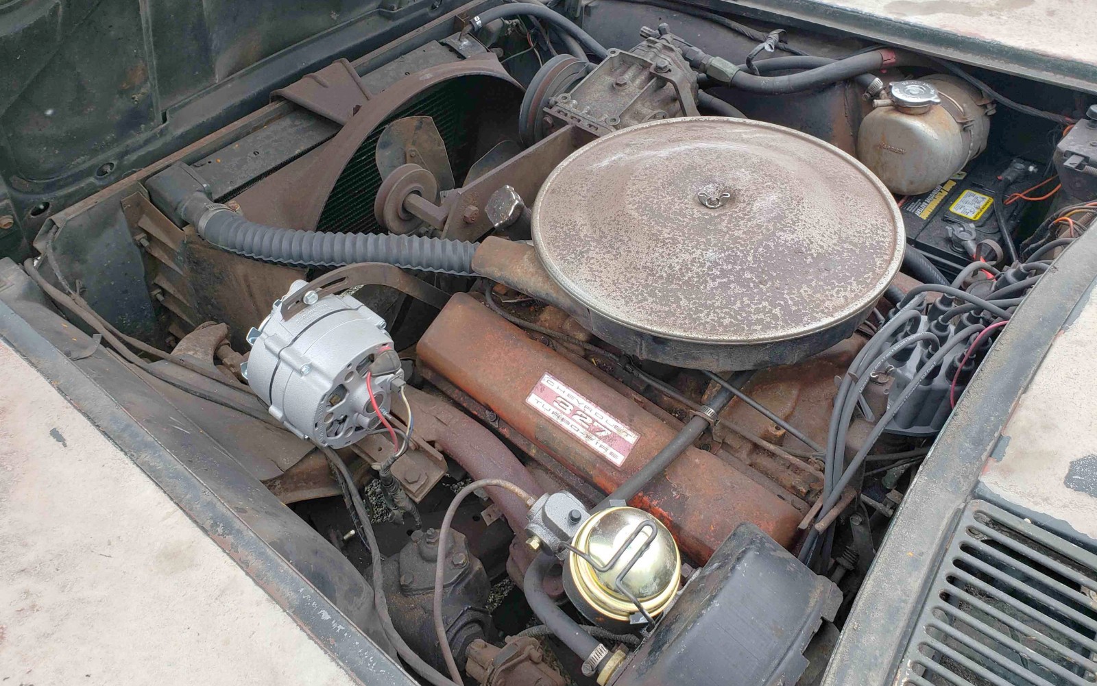 That had to be an exciting day! Possibly more so than the day it was picked up brand new. The new owner took the time to rebuild the carb and get the engine running again. It’s still not a daily driver, but is claimed to run, stop, and turn. The 327 V8 was the only engine size you could get, but it was available in multiple levels of output. This is the 300 horsepower one, so it slots near the middle. It would interesting to see what other options this one came with.