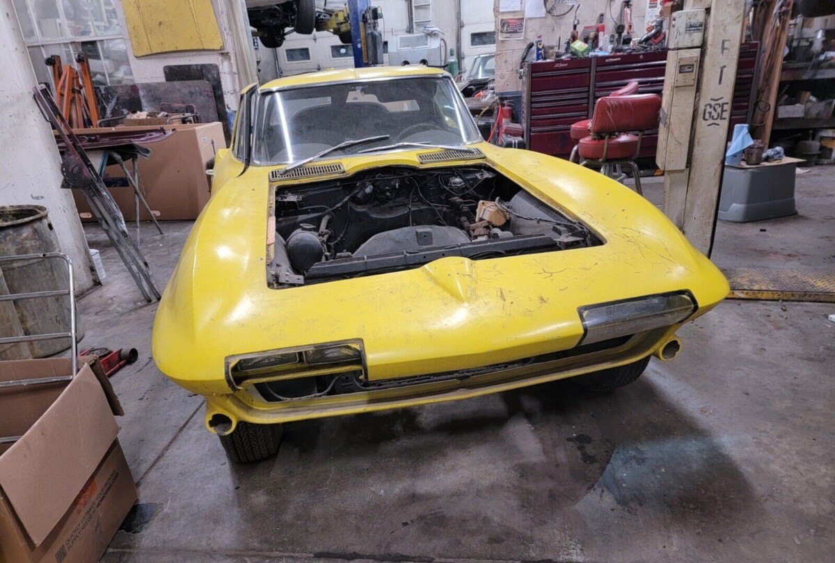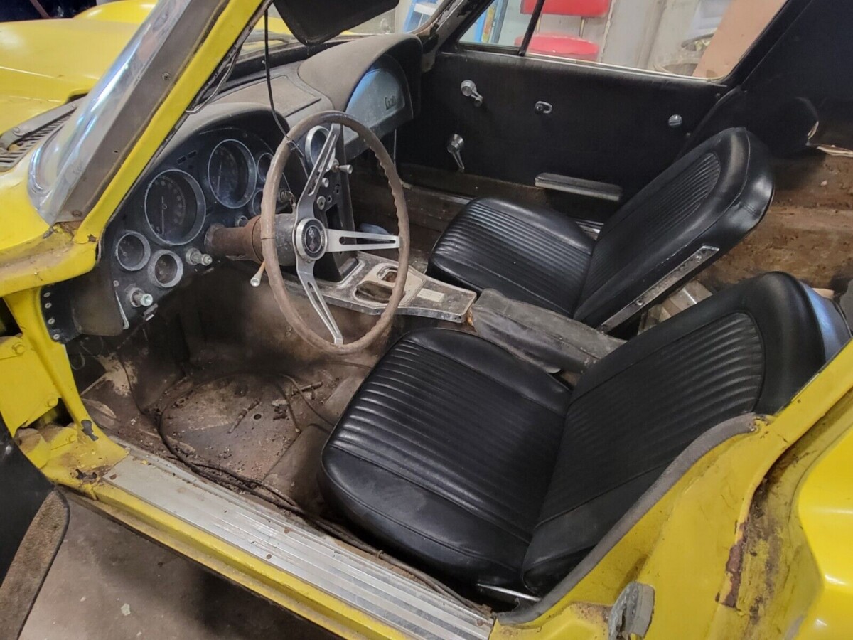 From what we can tell, the body is okay and yellow paint has been applied where blue once was (the interior was blue as well, according to the seller). The fiberglass may be fine, and all the stainless window trim is intact (important). The nose was sourced from Ecklers, and the headlights can be converted to rotators. The photos show the interior with and without bucket seats, but the seller says they’re “glued in” now. Out of 21,513 Corvettes built in 1963, 10,594 had the coupe body. We assume the survival rate increased over time once people realized the additional value.