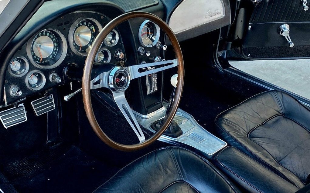 Why fix the clock it’s the wrong one leather seats in an old corvette hmmmm not sure if that’s the right chrome around windshield as they say it is should have put flat middle caps on instead of 70s caps