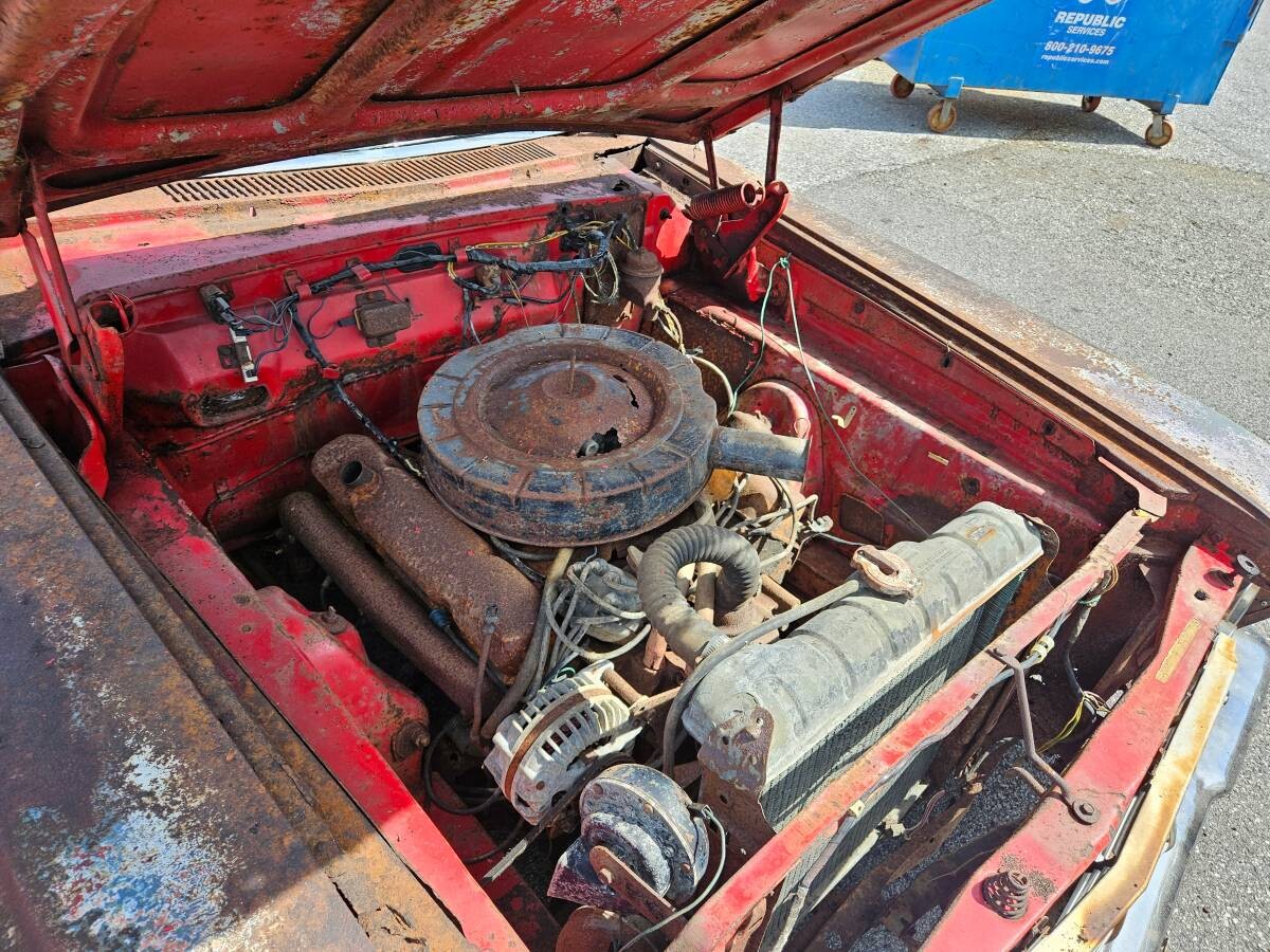 The hood ornament had a horizontal bar with the engine size on it. If it had a 426 the background of the numbers was red but it’s not clear enough to see it in the pics. I had a 64 Sport Fury convertible with a 426 and the pic of the dash looking through the steering wheel brings back memories. If you look at the speedometer and imagine the needle sticking straight down past the 120 mark I have seen that, foolishly. This car was nicely equipped but sadly about all I see now is a parts car. The price seems too high to me but parts for this car, especially trim parts, are not reproduced, so someone who is restoring one might see enough to make them buy it. GLWTS