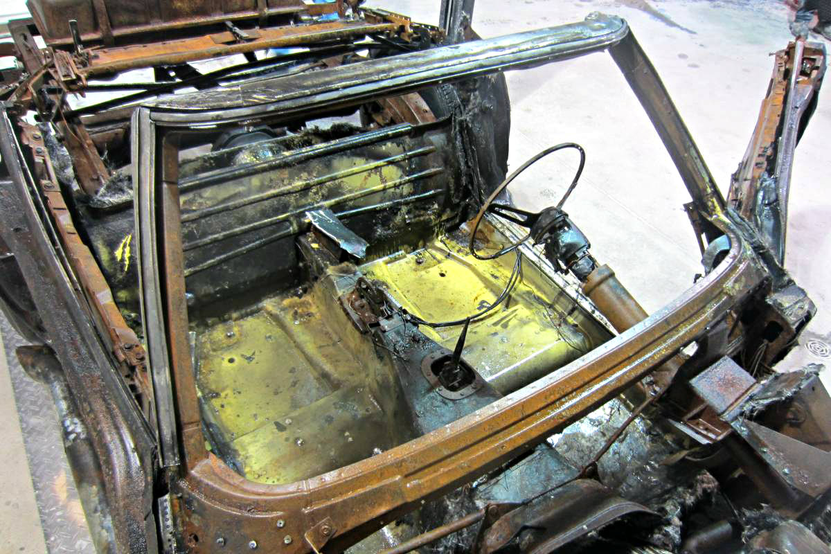 I lost a major car collection in 1973 to a lightning-caused fire in a barn, and again when lightning struck my antique car shop in 1998. Any vehicle in this condition will have lost the tensile abilities in every ounce of steel & iron, and that includes the frame. It may be rust free and straight, but not for long once it’s got weight on it and the torque from the motor will twist it out of spec. All the pot metal will have melted [and the carb would have melted & run into the manifold, possibly into the heads too.] Any soft items like suspension bushings are gone. All the soldered fittings on the radiator have melted, and while the windshield frame may look OK, I’m sure when measured, it will have sagged at the base where it joins the body. I’ve gone thru this with a total of 6 cars in the first fire, and 14 cars in the second fire.