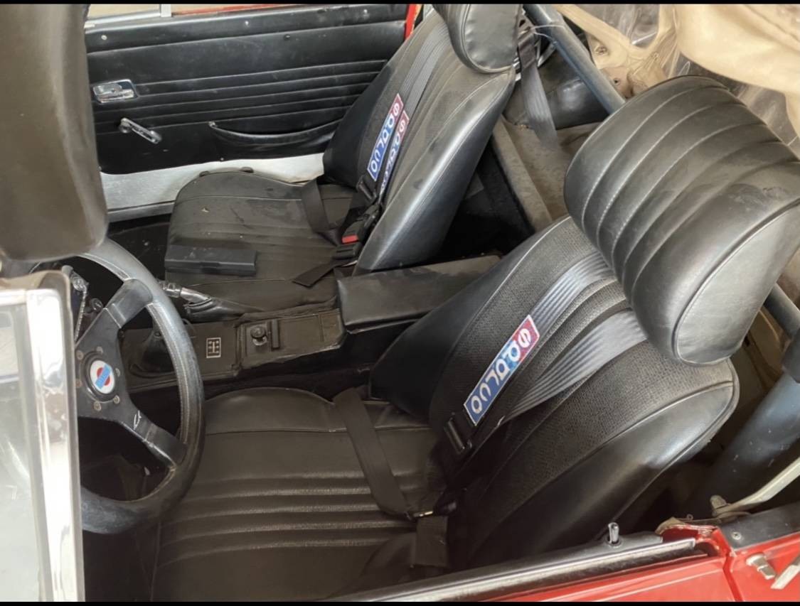 The little speedster has 99,000 miles on it, so the car has provided its share of fun in the sun over time. It’s said to run really well, having been given a full tune-up and a rebuild of the carburetors. Everything else is “up to date,” whatever that means. The passenger compartment looks quite inviting, with its Sparco racing harness, neat bucket seats and one-of-a-kind mono steering wheel (as the seller puts it). There is a small crack in the dashboard, however.
