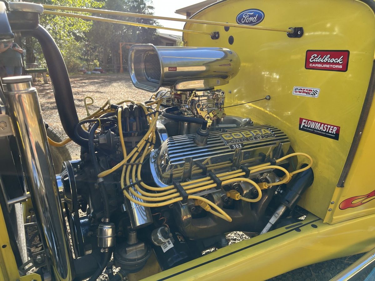 This is a decades old build of a fiberglass Model A roadster street rod. It has a few nice touches like the chrome underneath but the goofy decals, pinstriping, the huge tilt steering column and the odd ball scoop air cleaner make it pretty dated and not worth the price.