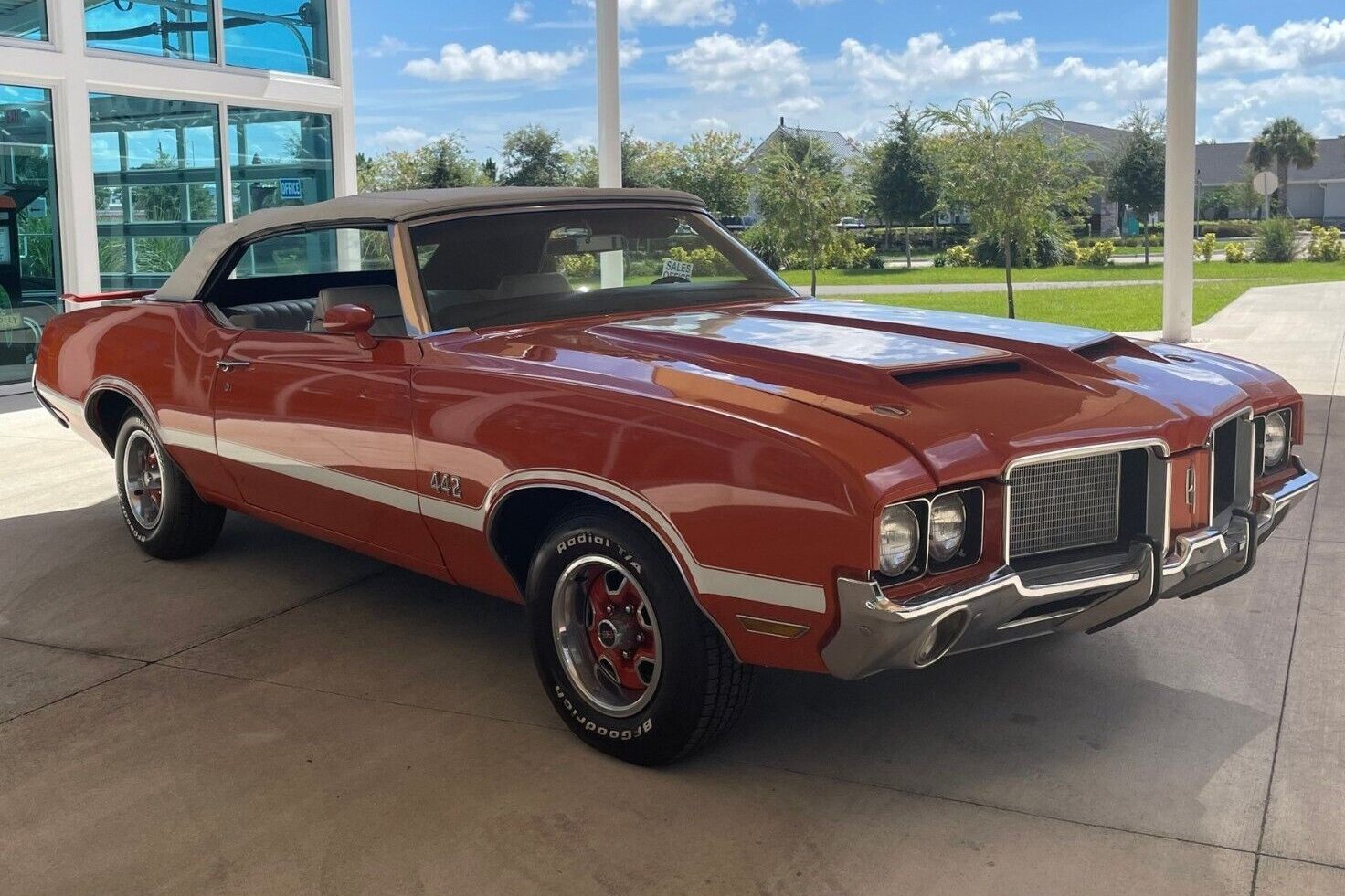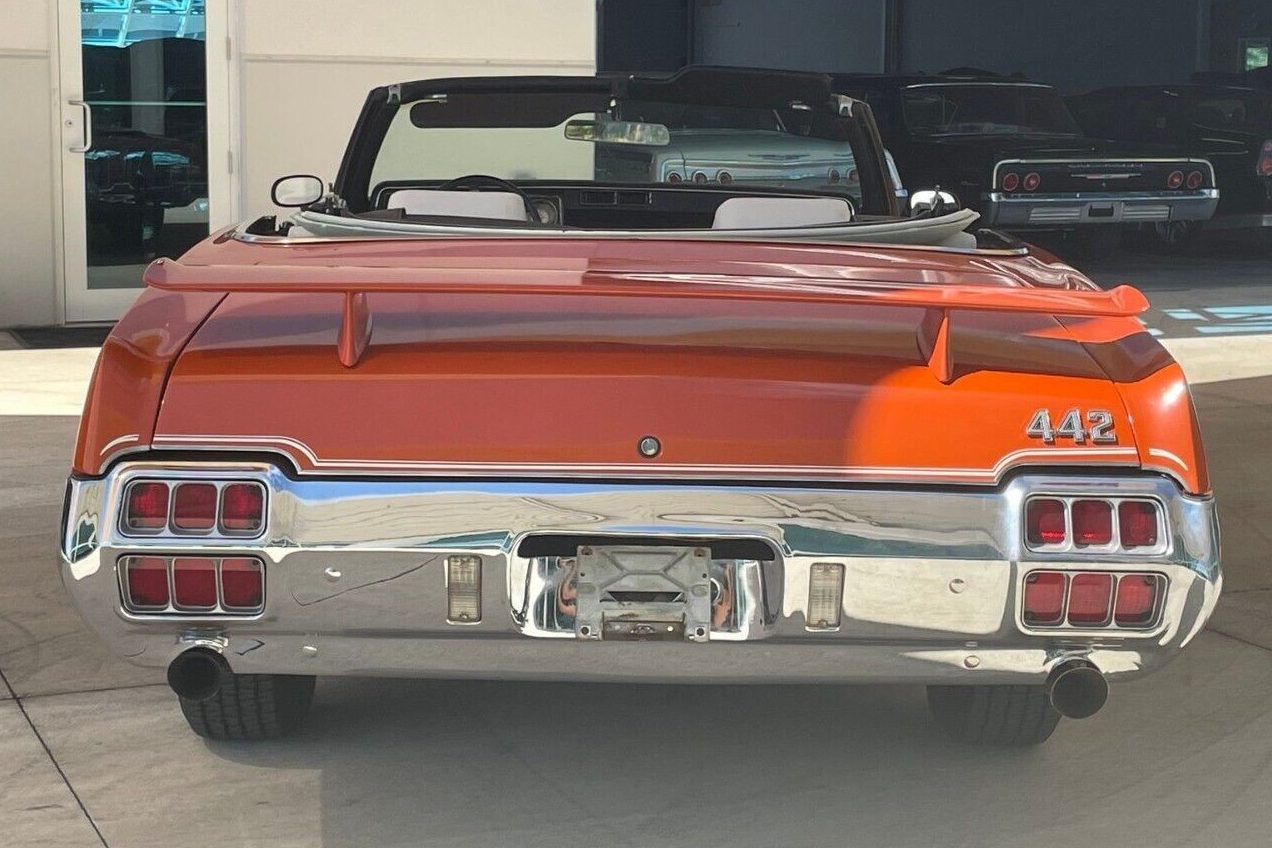 The history of this Olds is slightly unclear, although it looks like someone has spent a considerable sum to ensure it presents and performs superbly. The panels were massaged to perfection before someone applied a fresh coat of the original Code 65 Flame Orange paint to its exterior. This was complemented by White stripes and a W-30 hood to add a touch of purpose. The paint shines beautifully, there are no visible issues, and the underside shots confirm this classic is rust-free. The chrome and glass sparkle beautifully, and the White power top fits as tight as a drum. The color-coded Super Stock wheels are wrapped in tires from the good folks at BF Goodrich, helping to guarantee this 442 turns heads wherever it goes.