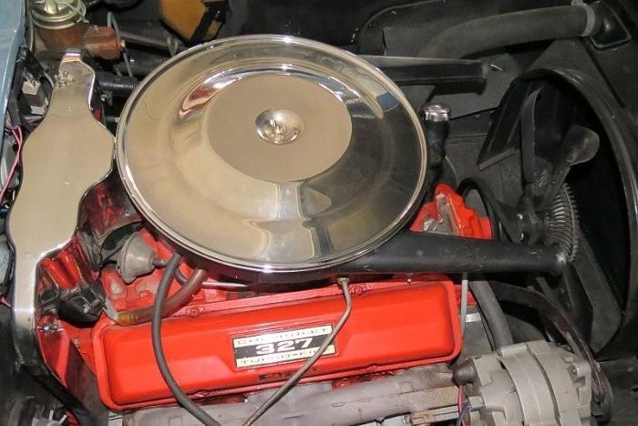 FYI My 62 327 340hp had a chrome cover over distributor as shown on the split window.