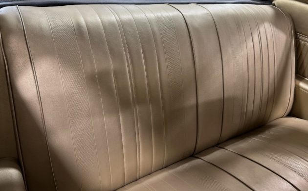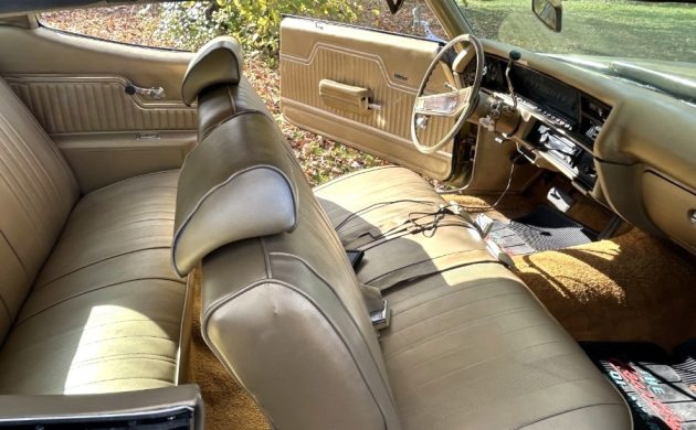 The interior’s color matches the exterior except for a white vinyl top or a painted roof (can’t tell which). The seats and door panels may be flawless, leading one to assume the passenger compartment has been refreshed. While I like what I see, I wish the seller had spent more time on meaningful content rather than telling us how blue the sky is.