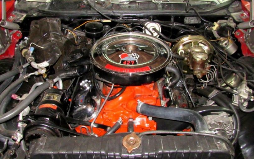 The difference between the Custom Coupe and the Sports Coupe is the roofline, the Custom uses the “squared-off” formal roofline of the Caprice coupe, first introduced in 1966. The Sports version continues with the sloped fastback roofline that first appeared on the redesigned ’65 Impala. The Impala Custom Coupe initially surfaced in 1968 and continued in production through 1976. There is no discussion regarding this Chevy’s past, as to whether or it’s a survivor or a restored car – whichever the case, it looks great. Rust is the enemy of this vintage Impala and this example is clean, no signs of corrosion top or underside, and the shunt lines are as even as they ever were in ’68, which isn’t always so even. This coupe is resplendent in its code R, Matador Red finish, it’s quite deep, and is finished off with a typical vinyl roof covering, also presenting itself excellently. The SS427 was recognizable by a few styling cues including the domed hood, front fender “gill” treatment, and SS427 badging in the grille, both front fenders and on the deck lid. The box-tipped tailpipes, however, are not original to this car and have been added. Mileage is recorded as 99K miles but there is no claim to that reading. Of note is the header emblem, the Chevrolet bow-tie should be red on this model and not blue.