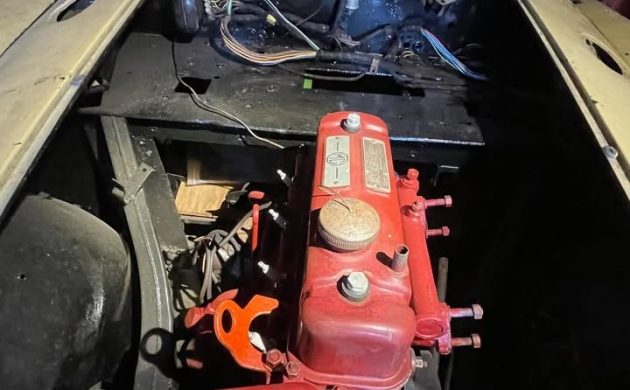 This car belongs to a transition year: in 1961, British Motor Corporation gave the “A” a bit more power and called it the Mark II. This car, though, is a Mark I, with the tail lamps mounted on the rear fenders, a grill flush with its body lines, and a 1588 cc four-cylinder pushrod engine. Twin SU carburetors should hang off the right side (this view), helping produce 79.5 hp. Yes, BMC quoted horsepower in fractions… A three-syncheo four-speed manual brings power to the ground. BMC gave a nod to mechanical advancements, with disc brakes on the front wheels and rack and pinion steering. The seller notes that this car has been stored since 1976, and the motor was rebuilt “a few years ago” and is apparently ready to run.