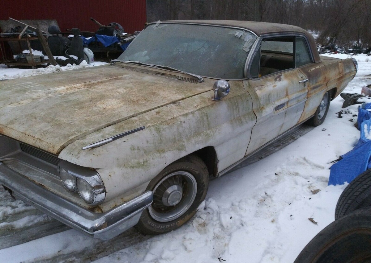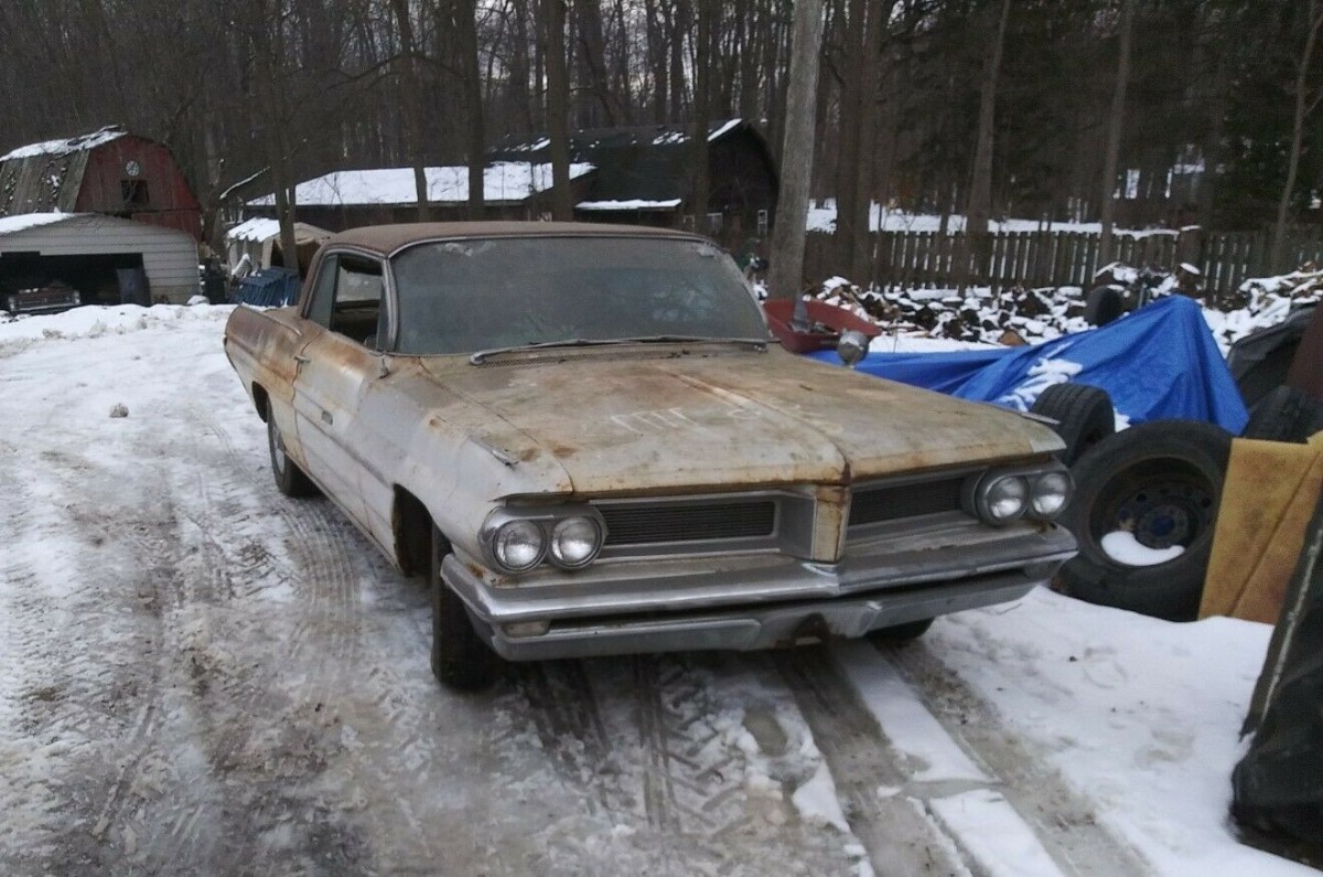 I like these style Pontiacs from ’61-’64. Its a basket case but its all in one basket! Do they even reproduce those 8 luh wheels?