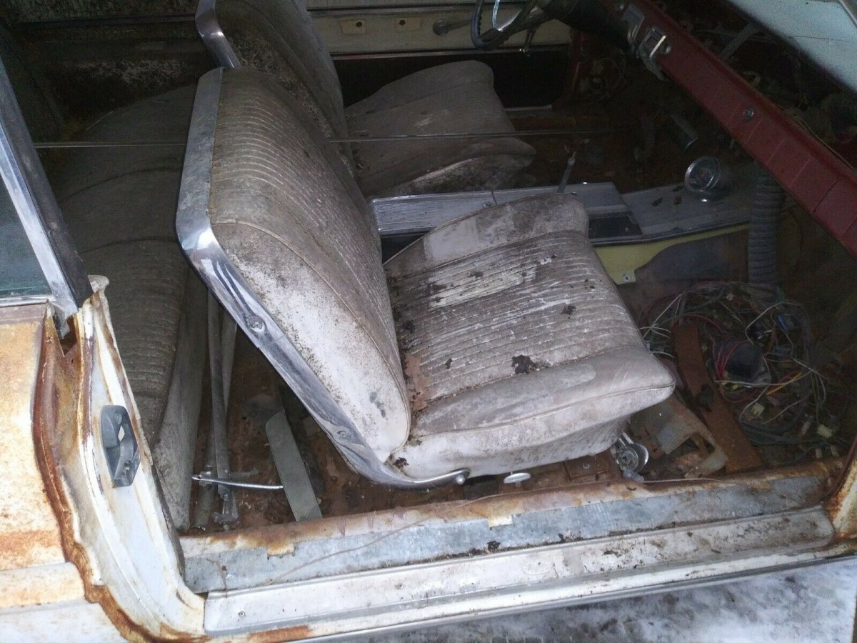 While the body is said to be solid, there is no shortage of surface rust that probably goes beyond what might be thought of as patina. The car will need repair work in the trunk as well as in the quarter panels around the rear wheels. The buyer of this car will receive some solid cut out pieces that came from a 1962 Pontiac parts car. There is also some hail damage in the roof that will need correction. We’re told that the interior is in better shape than it looks and that a good cleaning will do wonders. But the carpeting is shot, and the dashboard will need to be re-done (the instrument cluster is in the trunk). One savings grace is that the unique 8-lug wheels are said to have held up well.