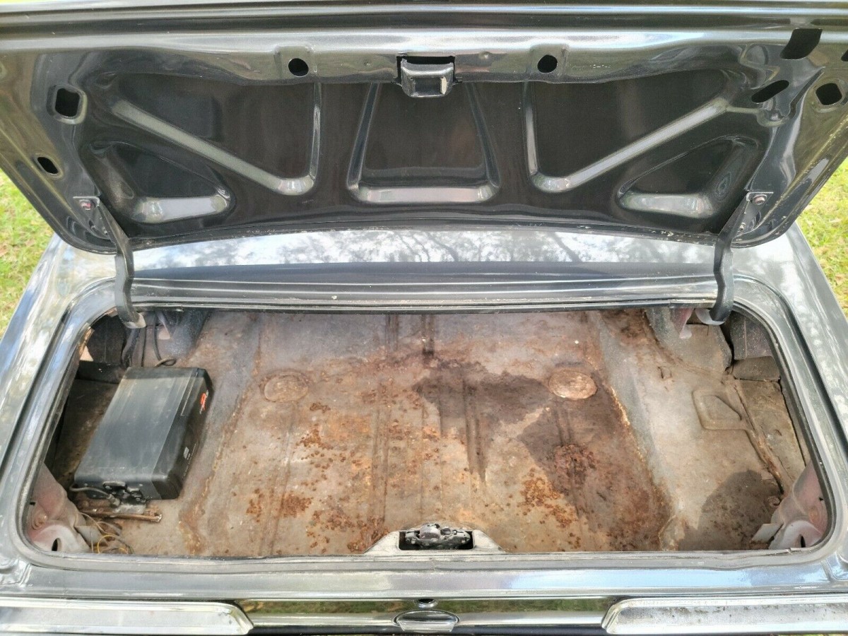 Most people undertaking a restoration would start with the chassis and work their way out. In this case, taking care of the driver’s floor pan which, the seller says needs to be redone and the trunk floor which has a lot of surface rust, at a minimum. We don’t get to see what the car looks like underneath, and we must wonder what issues may have been present with the body before the respray occurred in a color the seller calls black but looks more like a cross between dark grey and green. The wheels don’t match and they’re rusty.