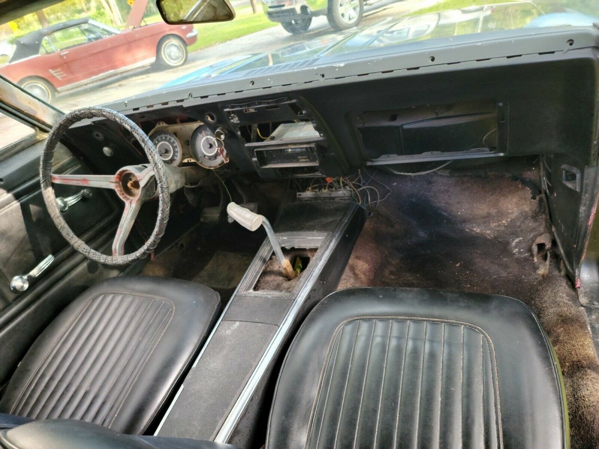 The upholstery looks good, but the carpeting is shot and there is no dash pad on the dashboard which has several missing items. The back glass in the convertible top needs replacing and we’re not sure if the whole top will have to go. We’re told the car has a 350 cubic-inch V8, which debuted as an exclusive to the Camaro in ’67 before the rest of the fleet got it in ’68. Most of the time, you find a 327 under the hoods of these cars. We’re told the motor turns over but does not run, there is no photo of the engine compartment, but the transmission is a desirable 3-speed manual.