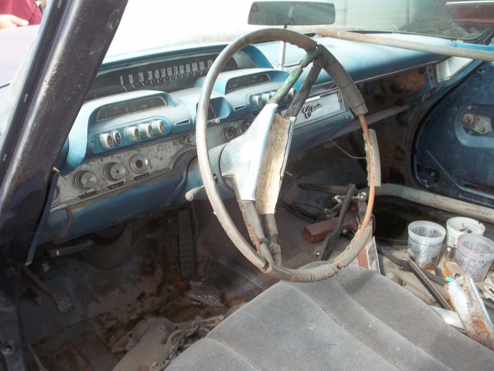 Claims to have all the interior, but no shots of it even in his warehouse or garage. Just the crusty wheel and late model bucket seat that’s in it. At least the dash looks good.