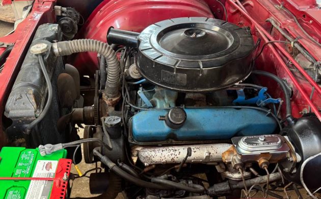 The black vinyl and cloth upholstery is said to have been “redone,” and it looks fine; the entire environment, including the carpet, door panels, and dash pad show as new. The seller claims, “all clusters work (instrument panel), air conditioning car,” though there doesn’t appear to be a compressor located in the engine bay, so I’m not sure about that statement. The only potential problem that I spied is what looks like a pulled-loose headliner over the driver’s side front seat. It may, however, just be the tucked-away shoulder harness that I’m seeing.
