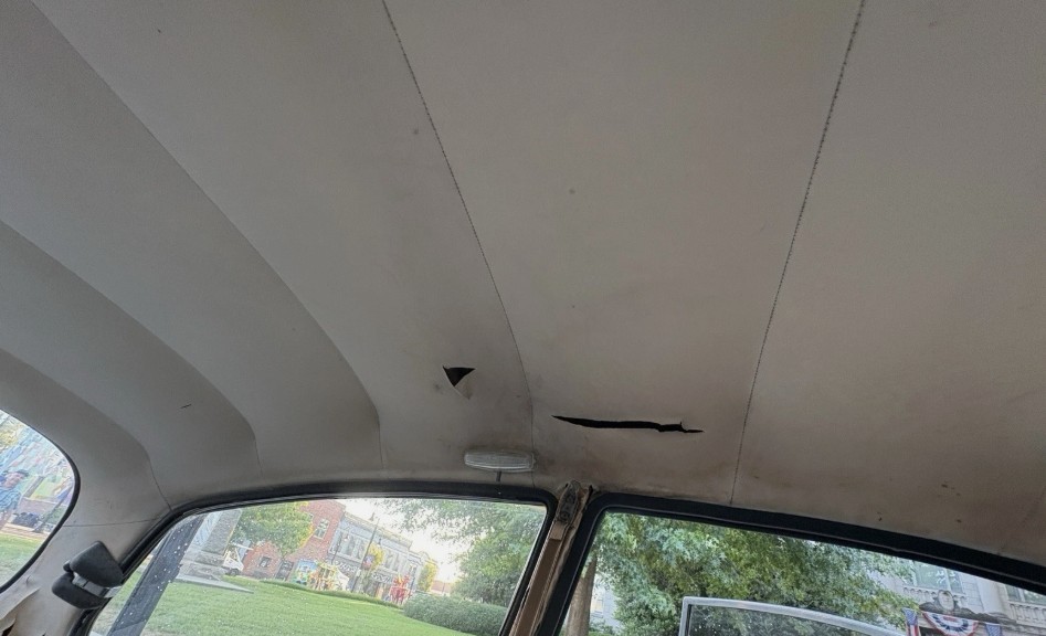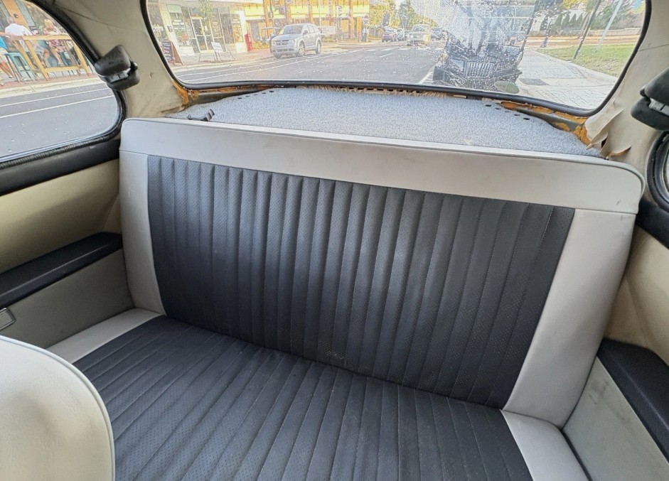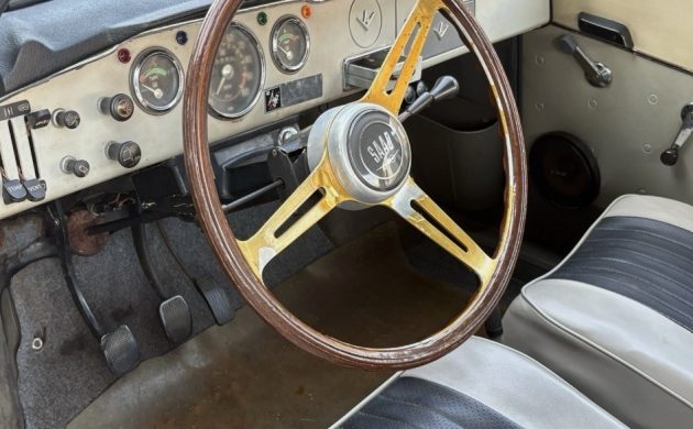 Other than a few tears in the headliner, the interior is respectable, with new-looking rear seats, a wood-rimmed steering wheel (losing its gold coating off the spokes), and clean carpets. I would probably replace the foam in the front seats, but the upholstery is free from tears or stains. The trunk is carpeted, and the seller notes that the original jack and tools are with the car.