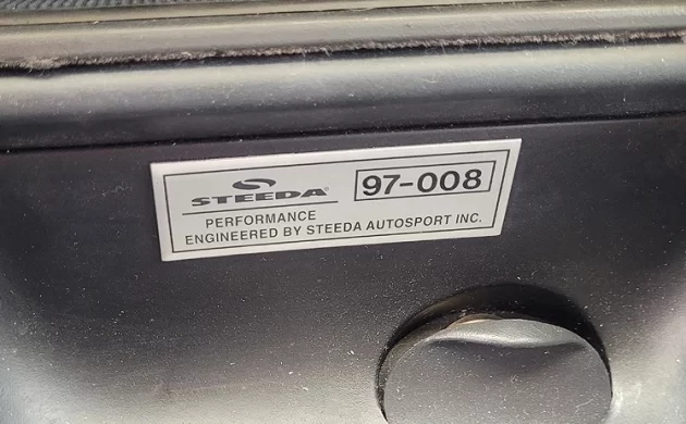 More about the Steeda connection: there was a supercharged SN95 offered by Steeda, and it was well-documented in popular magazines at the time. Typically, a genuine Steeda car will come with a serial number or plaque of some kind that confirms it was breathed on by Steeda at some point in its history. There is this badge right behind the shifter, which appears to be the genuine article. But what, then, are the enhancements? From what we can see, there are floor mats, a decal kit, and some stickers on the exterior, but not much else that designates this a limited-production, high-performance build.