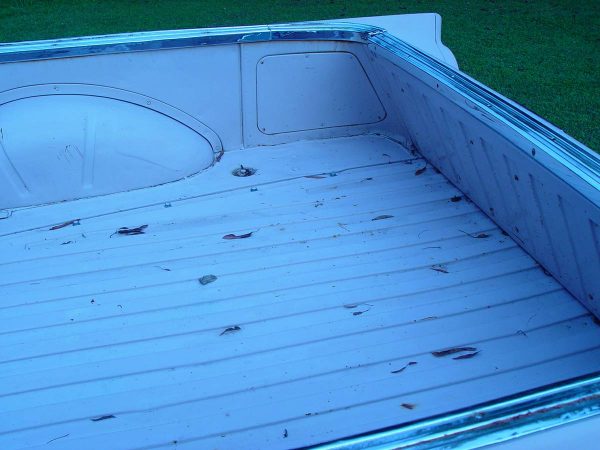 Chevrolet actually beat Ford into the market in 1955, with what was known as the Cameo Carrier. It was nothing more than the deluxe 1/2 ton truck with a fancy fibreglass side over the original box, and the tailgate was also clad in fiberglass with cables on a retract real to replace the chains. It was built with both the Chevrolet and the GMC nametag, but they only built approximately 320 of the GMC branded trucks. The truck was built between 1955 and 1958, when it was replaced with the fleetside box and the El Camino.