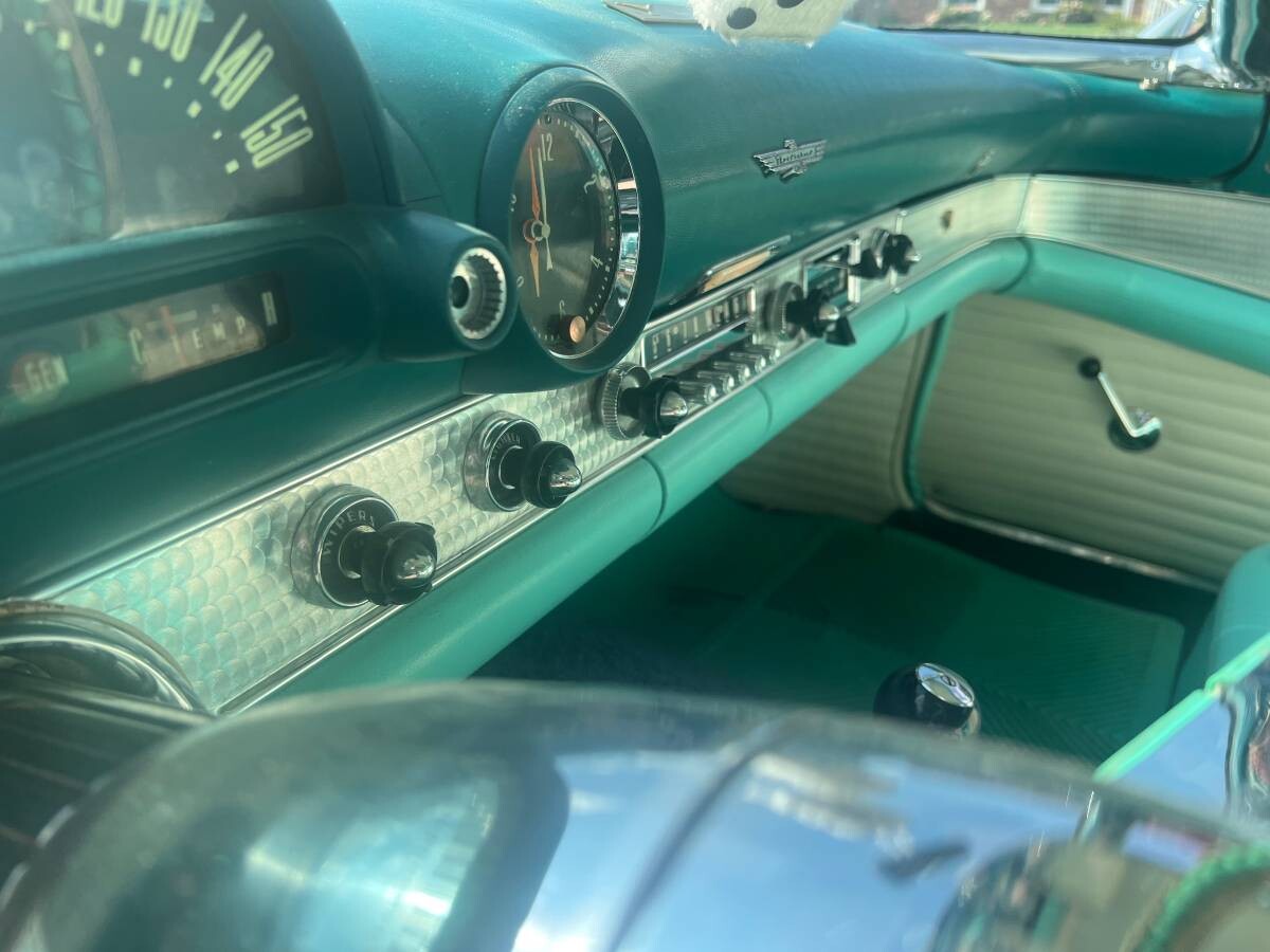 So let’s see what’s here, and ponder a little bit what course of action would be wise. This T-Bird is as aquamarine/teal as a car can get, from the top of the removable hard top to the steel wheels to the interior. Only wait—the color is actually Thunderbird Blue, Paint Code 11115 as noted here. Who cares what they label it? It’s stunning (and identified in the ad simply as “blue”). The exterior is said to be never wrecked nor abused, and the car is labeled, “Factory original everything.” If you’re in the game on this one, though, you want to hear the seller say, “That’s the factory paint job,” just to be sure, because as we know, sellers do label repainted cars as original when the color is the same as the born-with hue. On this car, the interior is clean and unmarked, with signs of age in the gauge glass, the (covered) steering wheel, and perhaps on the driver’s seat. Not surprising given the age, and not particularly concerning.