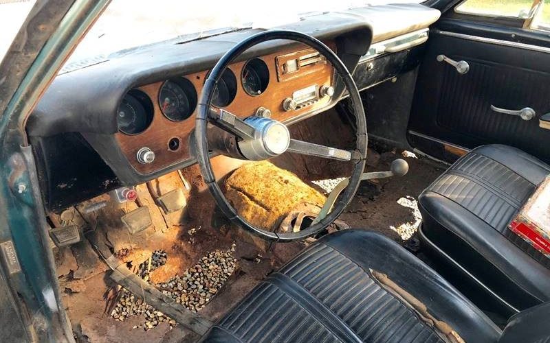 If you look at the floor, you can see what will be the biggest challenge of restoring this car. What looks like gravel on the floor is in-fact, gravel under the car. Yep, this car’s floor is almost completely gone. The trunk photos show a similar story. There is a photo of the rockers and frame that show severe rust damage. This close-up photo of the driver’s floor show just how much of the structure is gone.