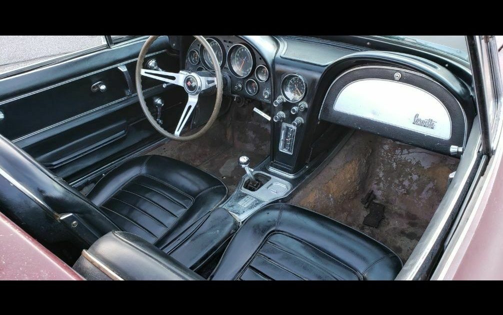 Lacking carpet, the interior appears very reasonable in this Corvette. With a fresh carpet kit and a good cleaning, this would be a perfectly acceptable interior for a survivor and a driver.