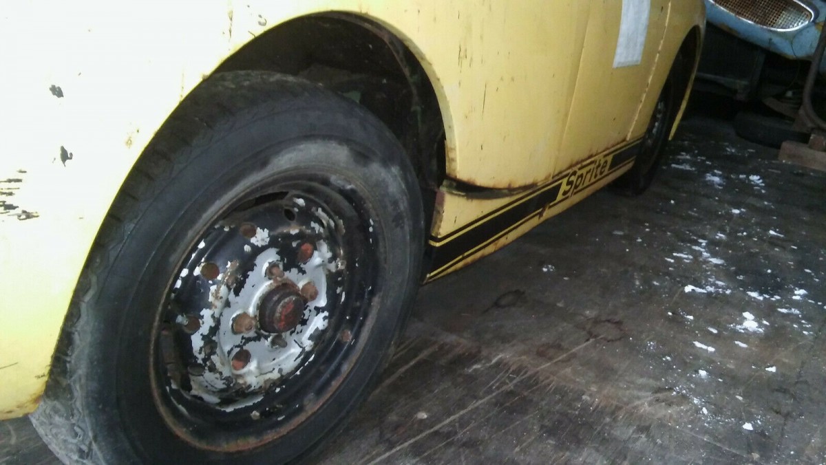 Two unusual things about this picture: 1) there’s some weird wrinkling and surface rust where the rear deck (think where a trunk lid would be on a normal car) has been damaged. I’ve seen this kind of damage before on a Sprite from a taller vehicle running over it from behind and I’m guessing that’s what happened to this car — then it was crudely hammered back out. 2) What about the other Sprite in the background? Is there a possibility of a package deal?