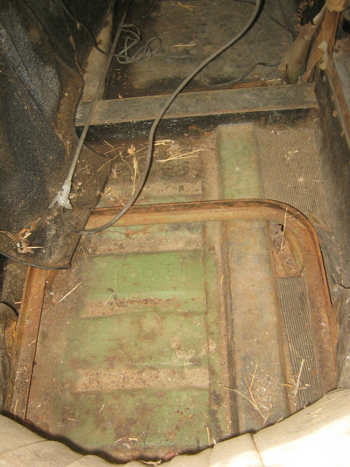 The floor looks surprisingly solid here, and you can also get an idea of what the Leaf Green paint should be. I believe that’s the bottom of the seat frame looking like curved angle iron.
