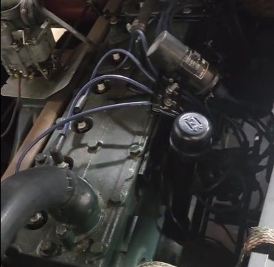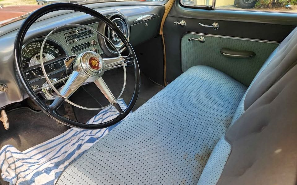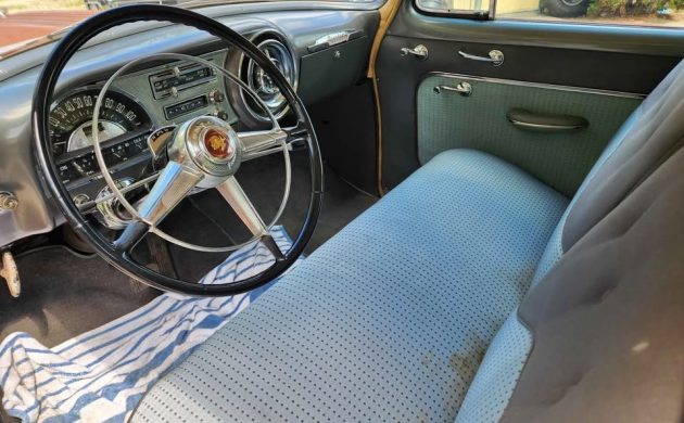 The Chieftain Deluxe was one step up the model ladder from the Chieftain Special, and in eight-cylinder trim like our featured car, it cost an extra $105. For that money, you got some noticeably fancier trim (which is in good condition, per the seller). I snipped this picture of the 268-cubic-inch straight eight from the seller’s video, and it was by far the most popular of the two engines Pontiac offered in 1954 (the other engine was a 239-cubic-inch six): 149,986 Chieftains had the eight; only 22,670 had the six. The 268 was in its last year in the Pontiac lineup, and with the Hydra-Matic, it produced 127 horsepower and 234 lb.-ft. of torque with a 7.7:1 compression ratio (the synchromesh cars had a 6.8:1 ratio). Notice the shield underneath the carburetor: That was a factory heat shield to keep the carburetor a little cooler sitting just atop that long exhaust manifold. Pontiac seemed to include a lot of good, thoughtful engineering in their early-to-mid 1950s lineup.