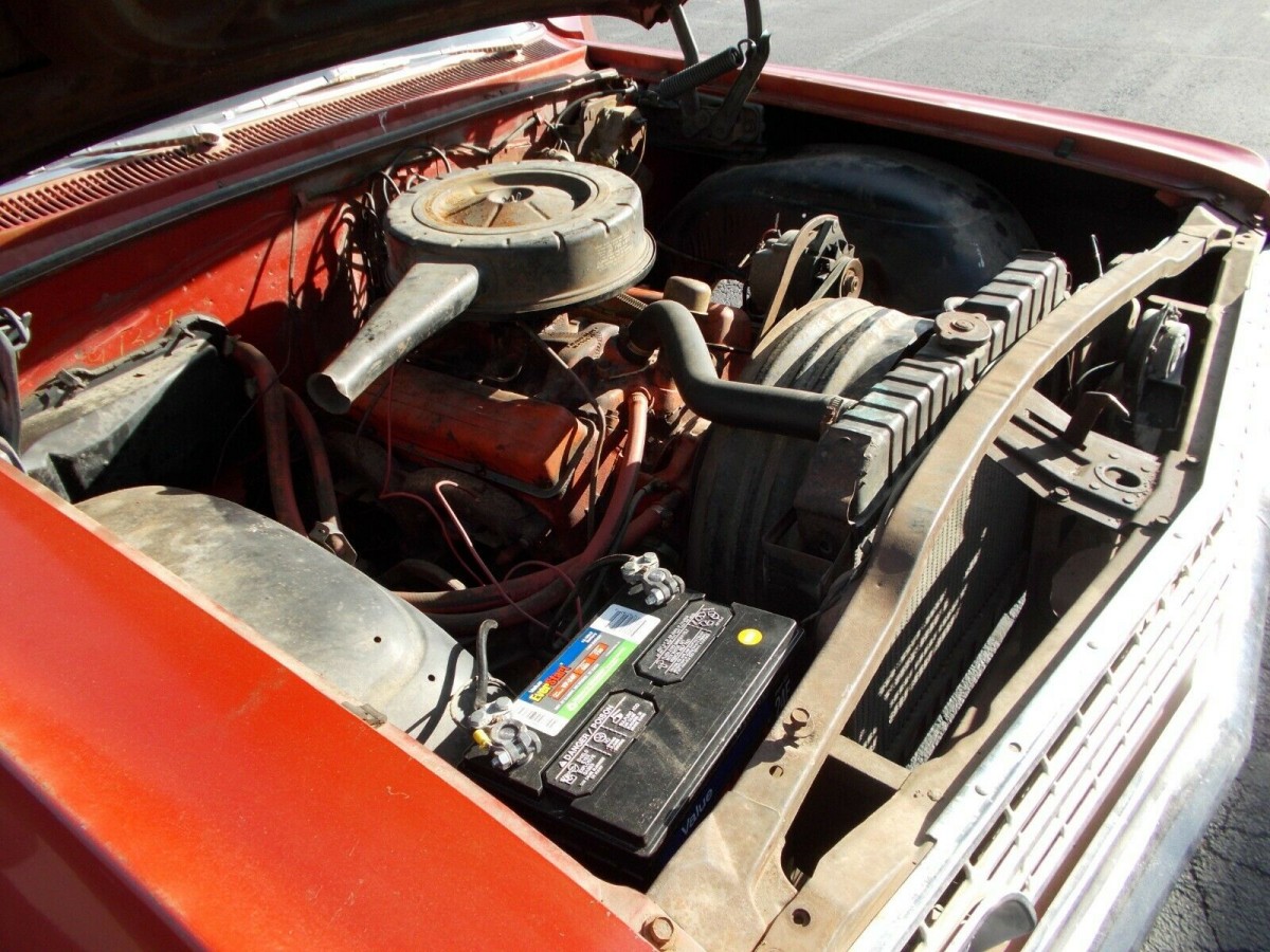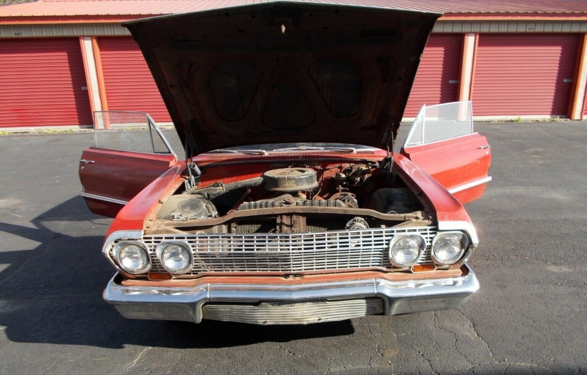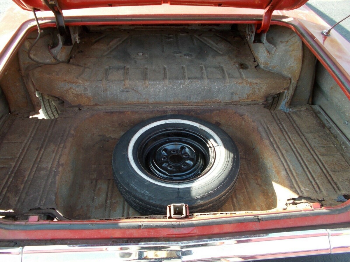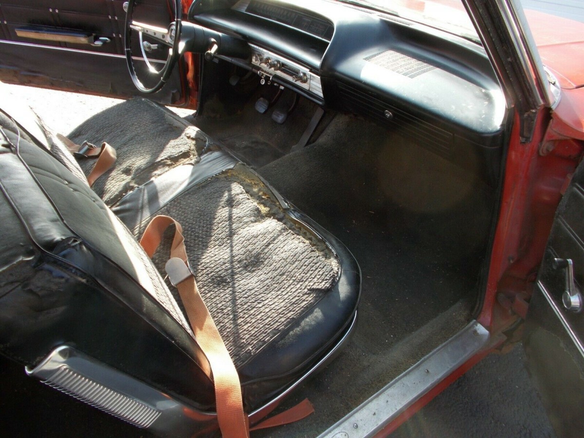 This is one of those cars to go into eyes wide open. The seller makes no bones about the rust, especially in the frame which he says is unusable. A storage locker apparently was home to this ’63 Impala for the last 10 years. I get the impression that if you got the car running as it sits, the undercarriage might give way. There are a number of holes that are said to make it unrepairable and the floor and trunk are in a similar situation. With the trunk open, you can see pavement in a few places. The fenders and quarters also have corrosion, but some of the chrome and all of the glass don’t look bad. The door, hood, and trunk lid all open and close properly.