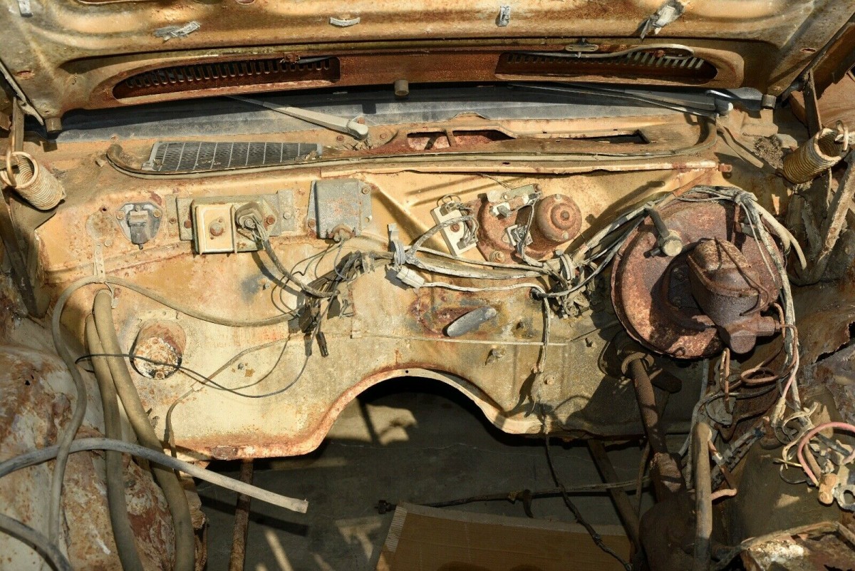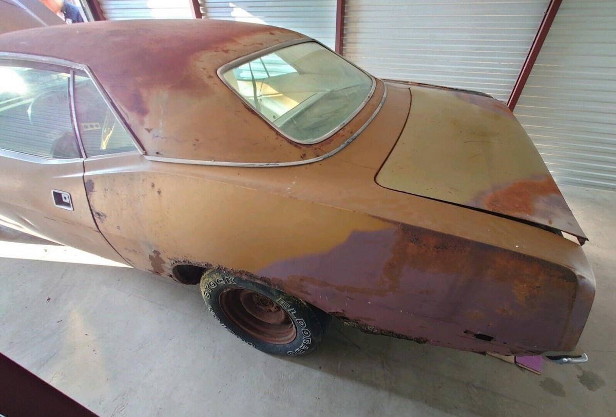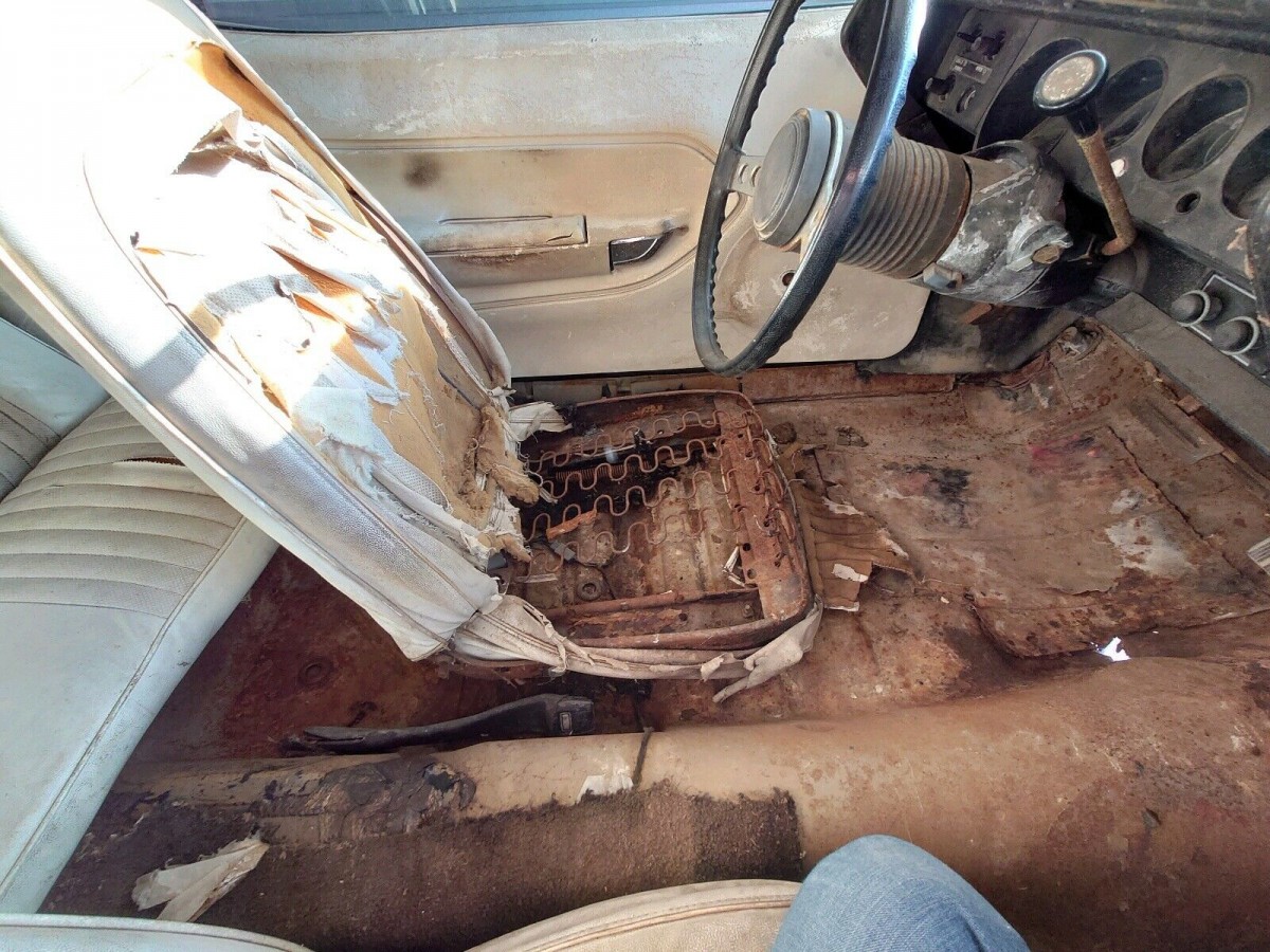The body is rough just about anywhere you look, and it probably wore a vinyl top at some point. There is either rust or dents in many spots and the driver’s side rear quarter panel has more rust than can likely be repaired, so replacing that would be needed. The floors have holes in them, and the trunk probably does, too, but you can’t tell for all the rusty parts stored in there. We’re told the tires hold air and the front-end steers, so it should load onto a trailer for transport, but there is no mention of whether there’s any working brakes to stop the thing once moving.
