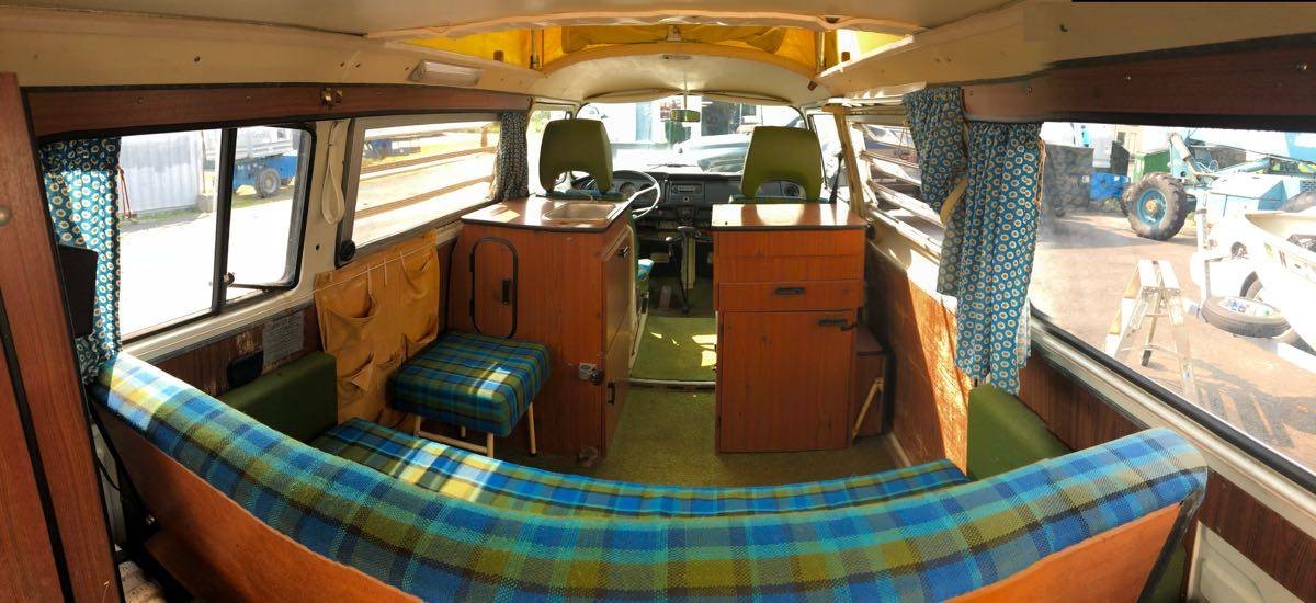 Check out that tartan interior! This is one of the most encouraging signs that a camper has been lovingly preserved as opposed to put away wet. The cloth seating surfaces is not only period-correct; it’s just plain nice, the type of cloth you won’t be afraid to sit in the first night away with this Westfalia. The cabinetry appears quite sound as well, and the curtains are a nice touch. Clean carpets are another hopeful indication that this camper was owned by hippies who at least showered once in a while.