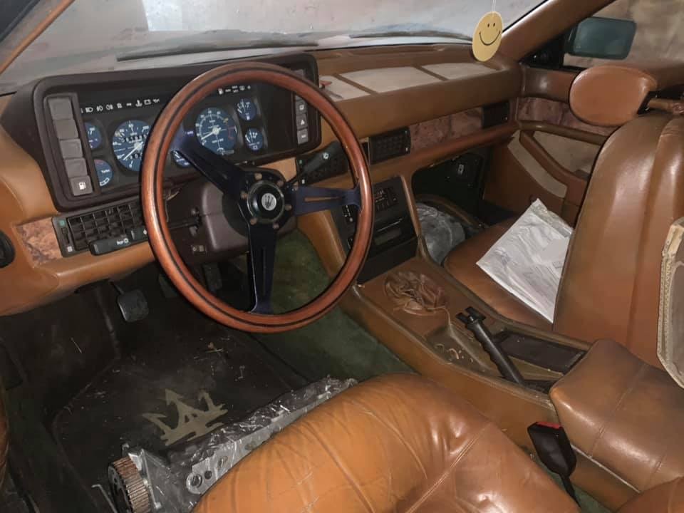 Fortunately for anyone who is still carrying the proverbial torch of the Biturbo brand, this one looks surprisingly nice despite being locked up in storage. Of course, long-term storage inside a dimly lit storage trailer has done wonders for the often fragile interior, with the acres of leather, wood trim, and thick-pile carpeting all presenting rather well (and is that a protective covering on the factory floormats?) This Biturbo is equipped with the preferred five-speed manual, but as you can see here, the transmission isn’t installed at present. The same goes for the engine, which was removed for head work and is now ready to be re-installed with re-done heads and a new gasket kit included.