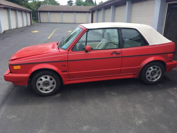 There are a lot of things about this ad that has me curious. For starters, the pictures show the car has just been pulled out of a storage unit. The seller gives no information as to how long and why it’s been in storage but mysteriously provides a picture showing a 1999 Pennsylvania registration sticker. I suppose it’s safe to assume that’s the last time the car was registered and on the road. If so then what’s the story explaining how a PA car ended up in storage in Upstate New York for 19 years? The body of the ad gives us no information other than simply repeating what we already know from the title: “1993 VW Cabriolet Automatic 75,000 miles.” Is the price too good to be true? The seller did take the time to indicate “excellent” in the condition prompt of the ad, and the car does look pretty nice with the exception of a huge crack in the driver’s side corner of the front bumper. Upon closer inspection, was the hood left ajar or does it not latch properly? The round headlamps were a signature look of 1st and 2nd generation Golfs, but oddly we aren’t shown a picture of this car’s front end. Is there more damage?