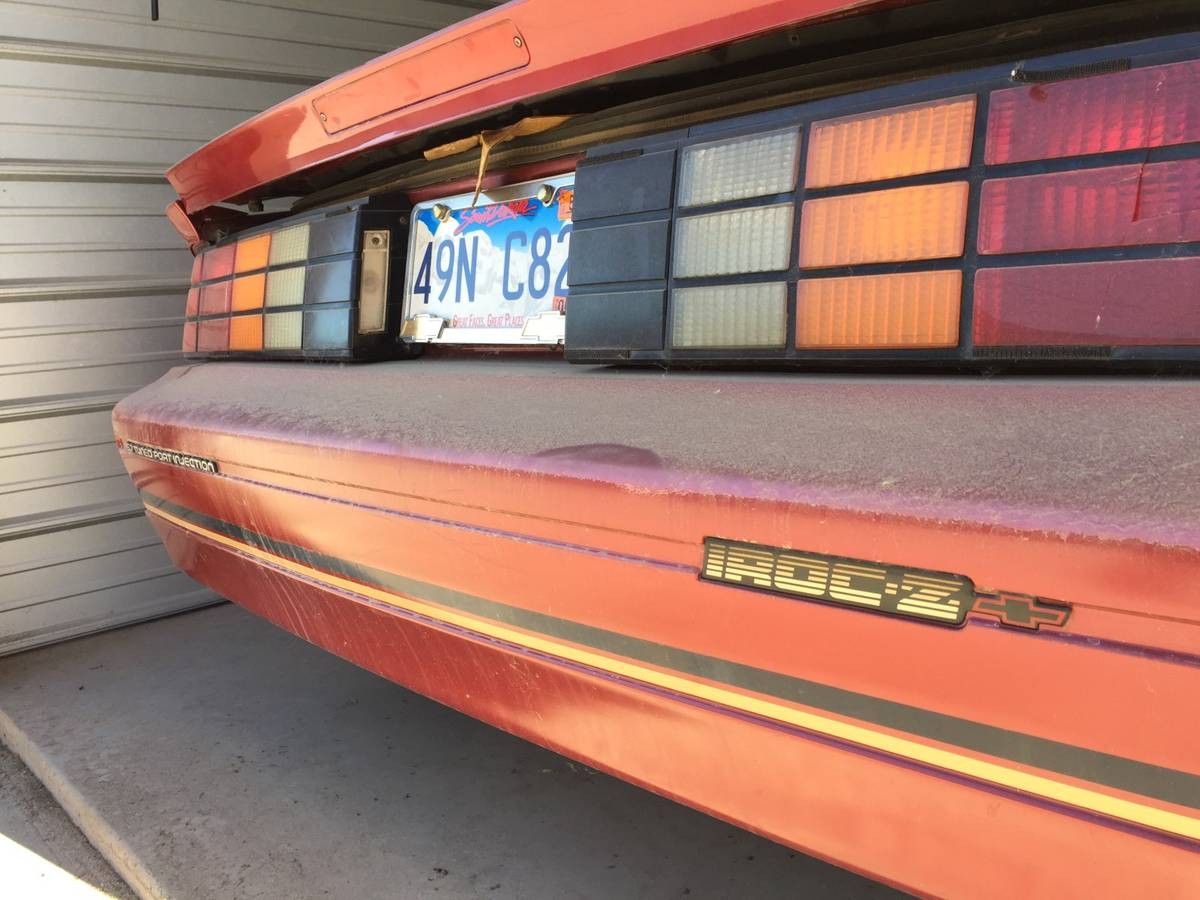 On the back of the car, the paint actually looks quite nice and the factory badges retain their original colors – as does the factory pinstriping. The taillight lenses are surprisingly clear, too, and the Montana license plates don’t look too weatherbeaten. Perhaps there’s hope that this Camaro isn’t as tired as an abandoned storage unit find might suggest. If it was repainted, it’s good to see the badges and stripes were re-applied.