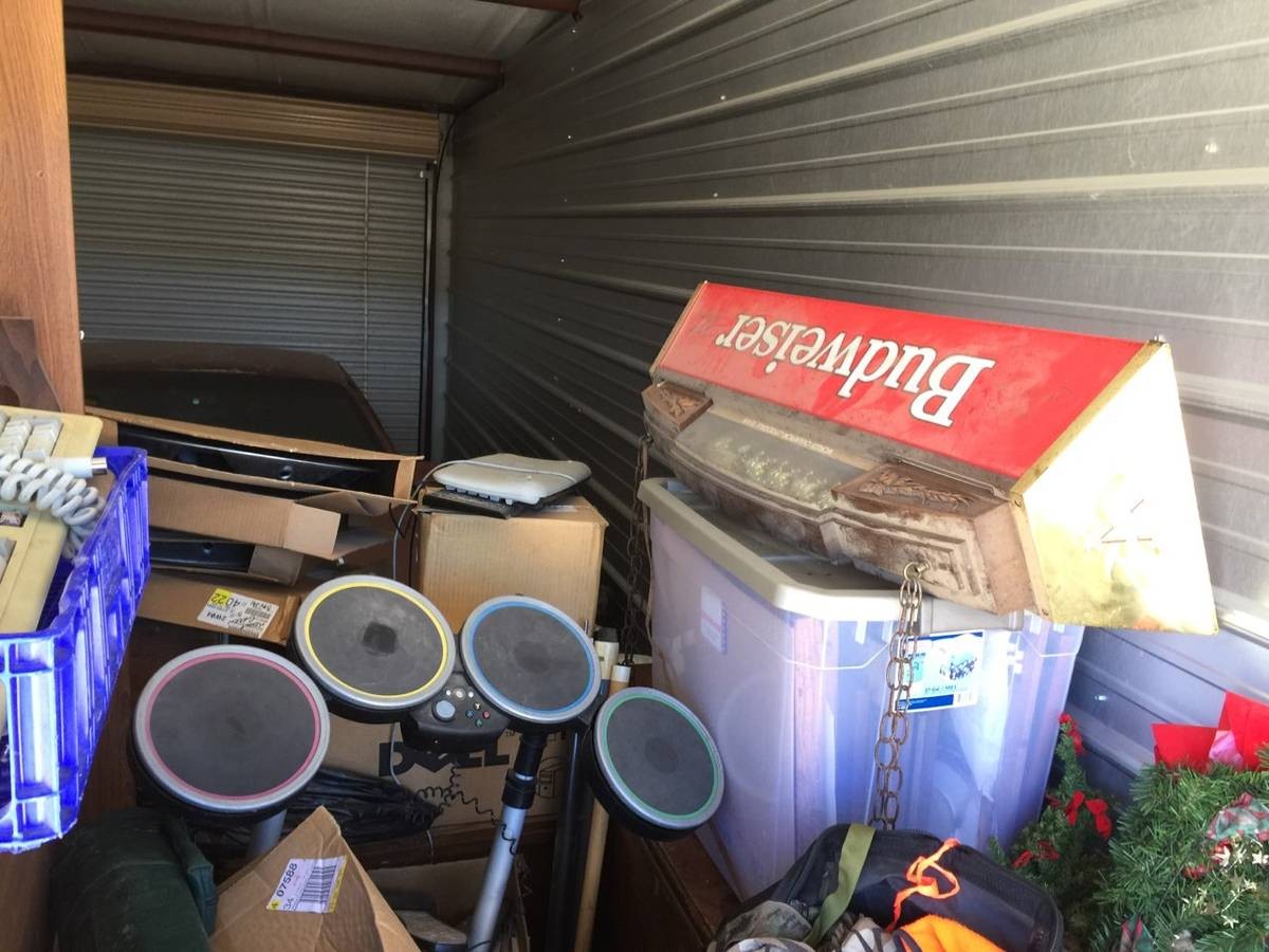 Here’s the view from the front of the locker, and if this isn’t a total 80s dude’s storage unit, I don’t know what else could be added to it to make it more so. The old-school Budweiser almost certainly hung over the pool table in his favorite local dive bar, and the drum set is just the sort of thing to make your backyard party go up the extra notch it needed to get people dancing and falling in the pool with their clothes on. Or something. Does $1K seem like a deal for the whole unit?